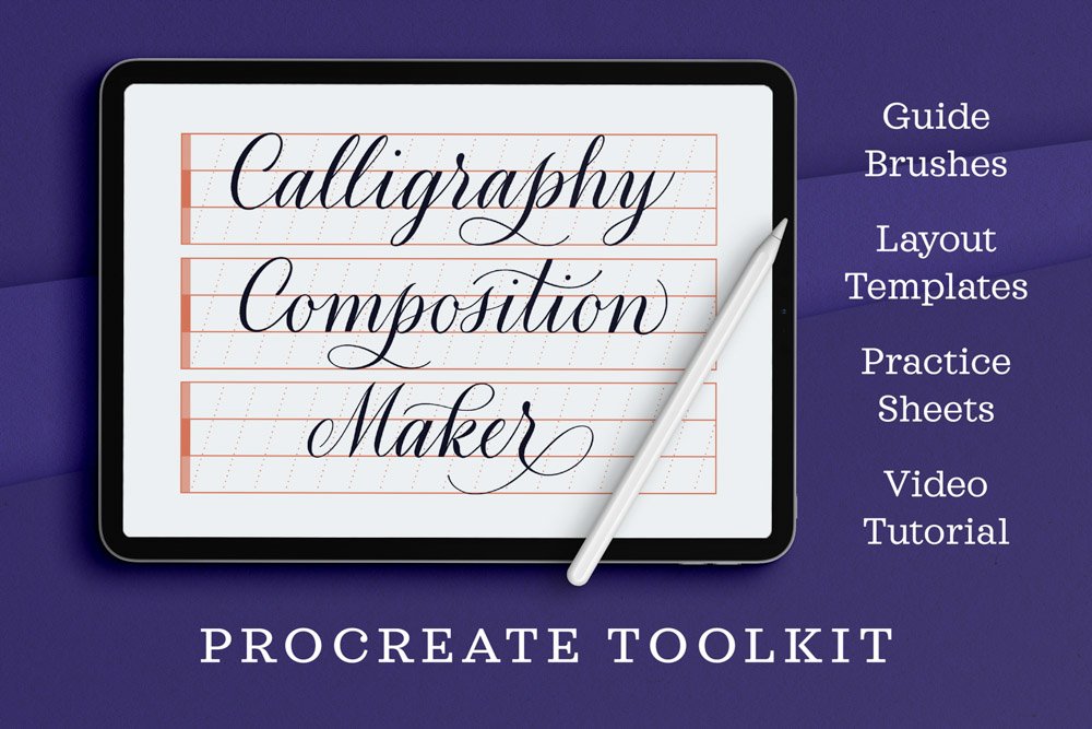 If you’re looking for Procreate or printable guideline sheets, I’ve published a couple options for you. My Calligraphy Composition Maker is the most robust Procreate calligraphy guideline bundle you can find, with 65 Procreate stamps and pattern brushes, layout templates, free practice sheets, and a video tutorial to teach you everything you need to get started. And my 30 Calligraphy & Lettering Guide Sheets bundle contains all the essential guide sheets you’ll need for countless lettering styles and layouts. You can print them for analog practice or install them in Procreate or any other app!