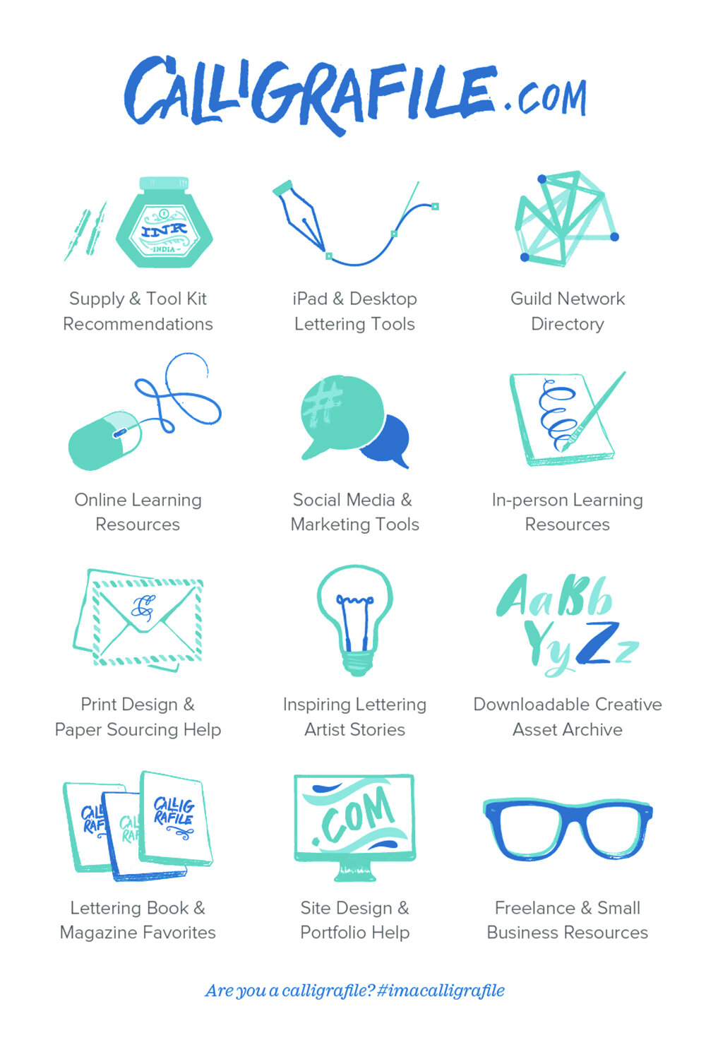 Calligrafile is a curated library of 500+ trusted supplies, online shops, learning resources, interviews, and business tools compiled by professional lettering artists from around the globe. I founded Calligrafile back in 2016, as a way to organize all my own favorite links, learning resources, and freelancing tools that I’d bookmarked over the years. I brought on a panel of more than a dozen contributors – professional lettering artists from many different backgrounds – who contributed their own favorites. The result was a resource library that compiled over 500 recommended resources, organized into 20 in-depth archives and galleries.