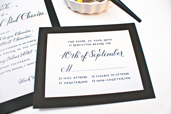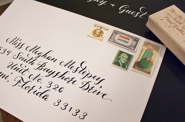 I just received the very top snapshot of this October wedding in Palm Springs from photographer Justine Ungaro. When I designed the invitation suite for this wedding, the bride wanted a classic look with a twist: black and white calligraphy accented with vintage stamps and an antique gold and black floral print matting paper. It all seemed perfect for a Fall wedding in the desert, and now that I've seen Justine's photography, everything fits even better. I especially love the juxtaposition of aqua water and the floral arrangements of crimson, bright pink, and cactus green.