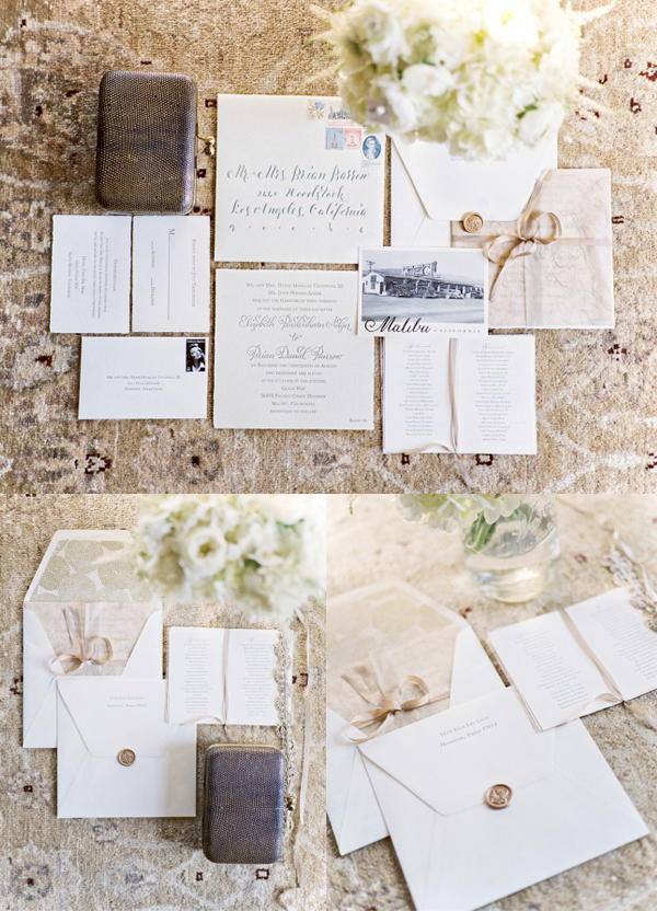 This is one of the most beautiful weddings I've ever had a hand in (literally). Bettina and Brian were married at Gull's Way Estate in Malibu, California last August. When I look through the photos, I am most struck by the stunning combination of colors and textures, from raw linen to fresh white flowers, and pink Thai silk to bone. My calligraphy — all warm grey ink on cream paper — was used in the letterpressed invitation suite, as well as day-of items like place cards, menus, and dessert table labels.