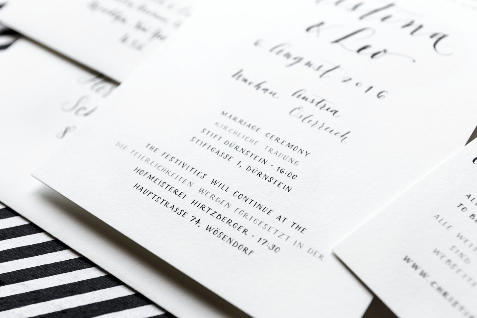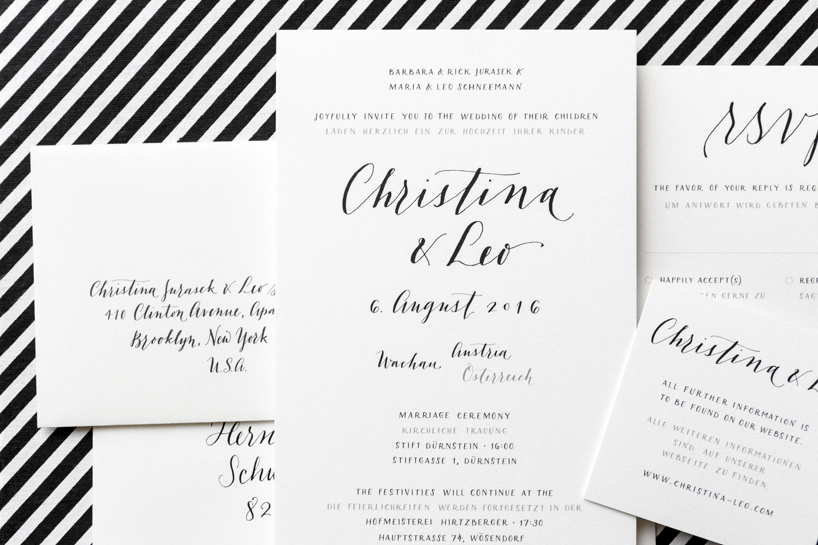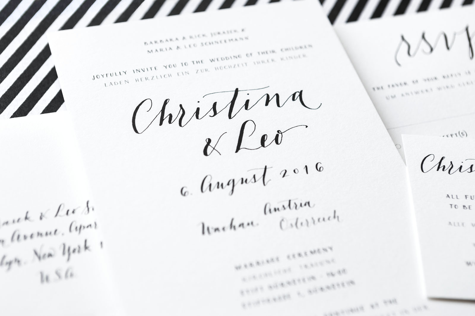Knowing her as well as I do, I barely needed Christina to tell me about her vision before I started drafting her invitation suite. It had to be black and white. It had to be modern and minimalist. And of course, I had to be English-German bilingual. The result was a quintessentially "Christina & Leo" invitation, lettered in a combination of script and small caps, and printed on luscious 220lb Crane's Lettra.