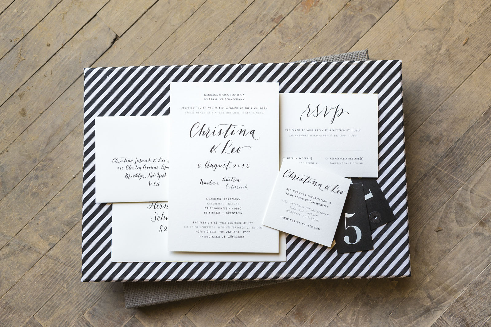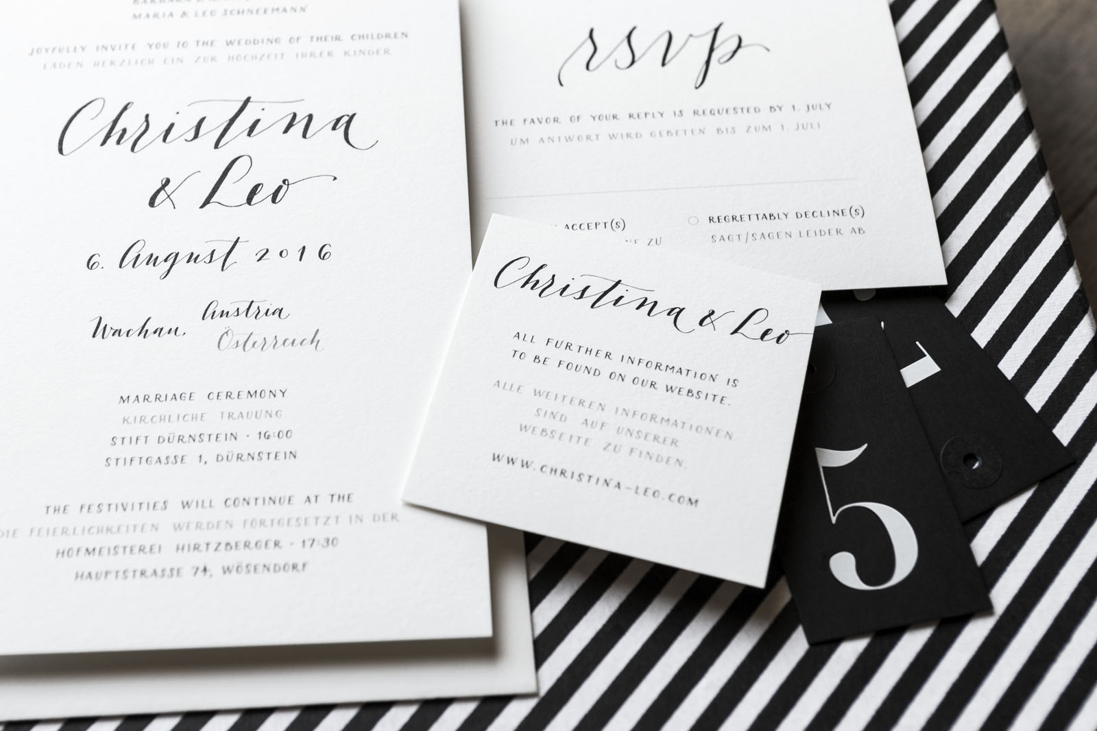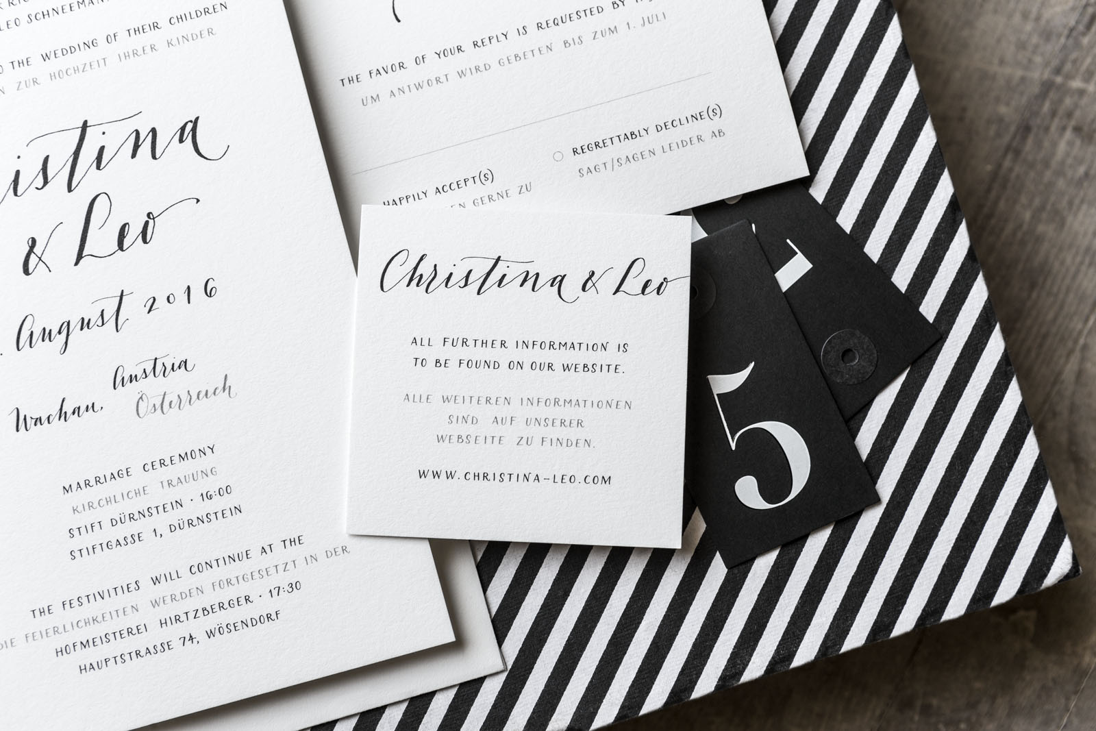 Knowing her as well as I do, I barely needed Christina to tell me about her vision before I started drafting her invitation suite. It had to be black and white. It had to be modern and minimalist. And of course, I had to be English-German bilingual. The result was a quintessentially "Christina & Leo" invitation, lettered in a combination of script and small caps, and printed on luscious 220lb Crane's Lettra.