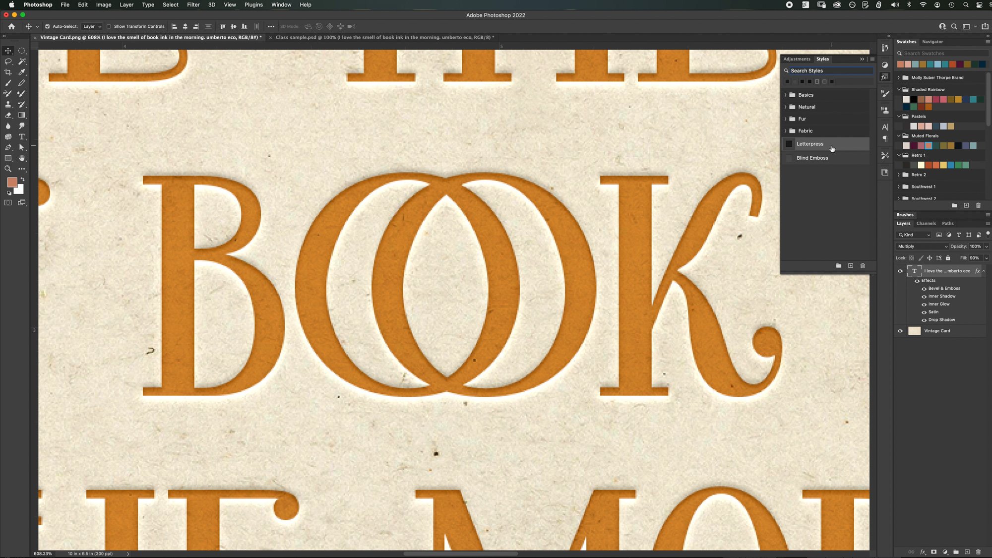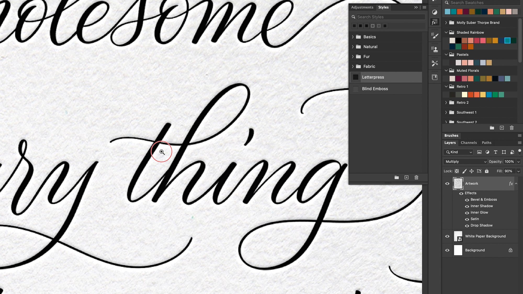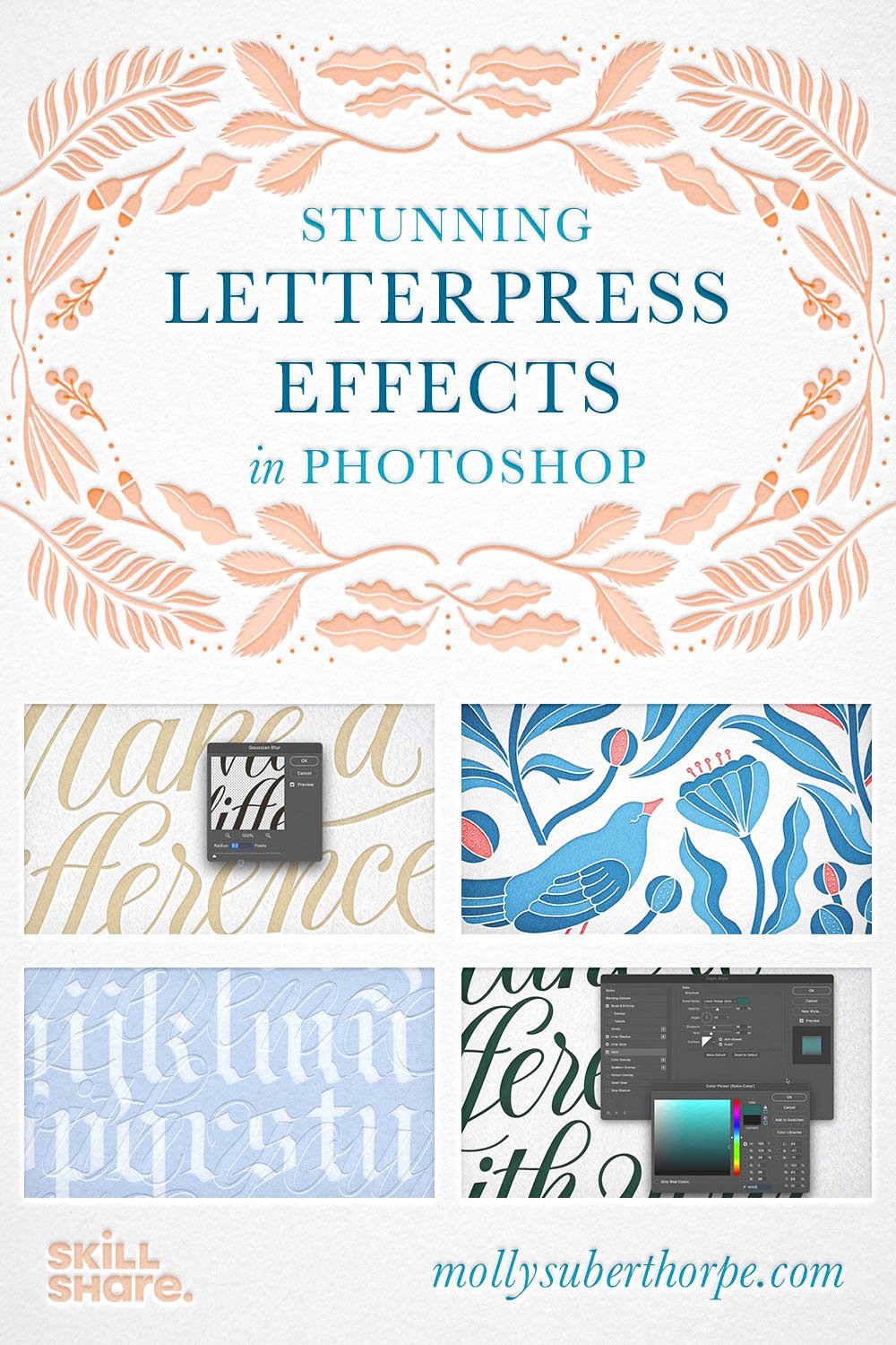 Over the years, I’ve perfected a combination of Adobe Photoshop effects – in conjunction with real paper textures – that emulate real letterpress printing with beautiful results. So now I’m sharing that technique with you in my Skillshare class, Digital Letterpress: Create Stunning Printed Effects in Adobe Photoshop.