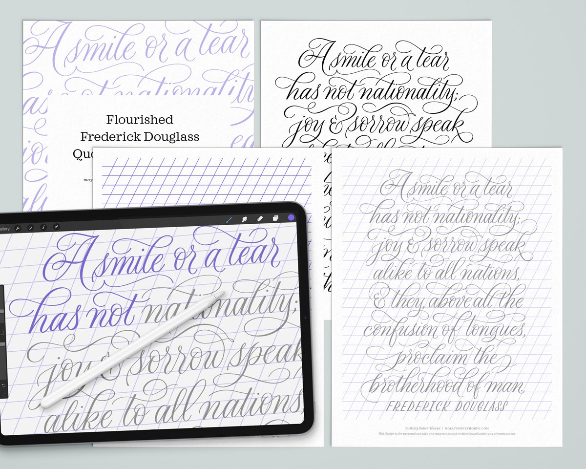 You can follow along from home using my free practice sheets of the same design. Simply get my Lettering Toolkit. Sign-up is free and takes only minutes. This design is called “Flourished Frederick Douglass Quote” and can be found in the “Flourished Layouts” section of my downloads portal.