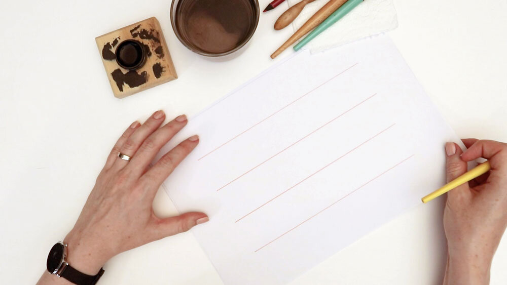 I have here just four basic grid lines that I’ve drawn with my transparent ruler. I am not using a calligraphy grid today, because the whole point of this exercise is not to adhere to specific slant lines, x-height lines, cap height lines, etc. In fact, this exercise is really about breaking free of habits and finding new modern calligraphy styles that you might not have found if you had otherwise tried to create them just from trial and error.