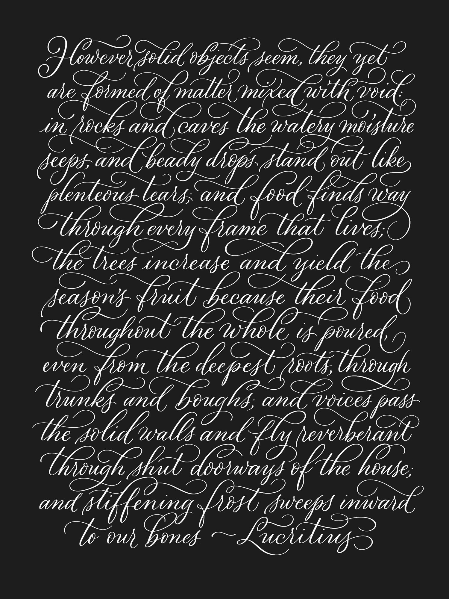 The text I’m calligraphing in the video is a beautiful excerpt from “On the Nature of Things” by Lucretius (c. 55 B.C.E.). It’s from the translation by William Ellery Leonard.