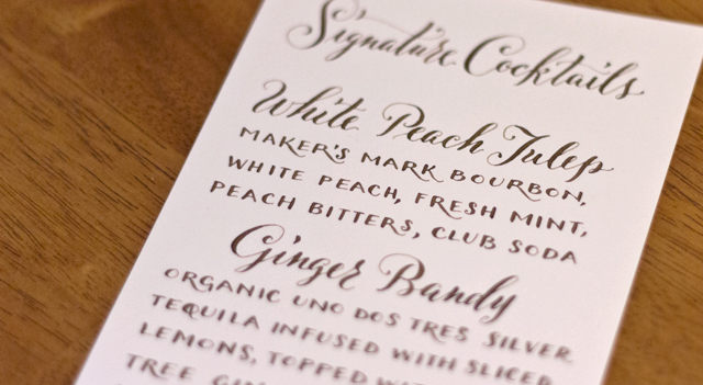 Calligraphy & Lettering A Ginger Bandy Signature cocktails! This bride and groom each designed their perfect cocktail and offered them to guests at their reception. Don't they both sound delicious?