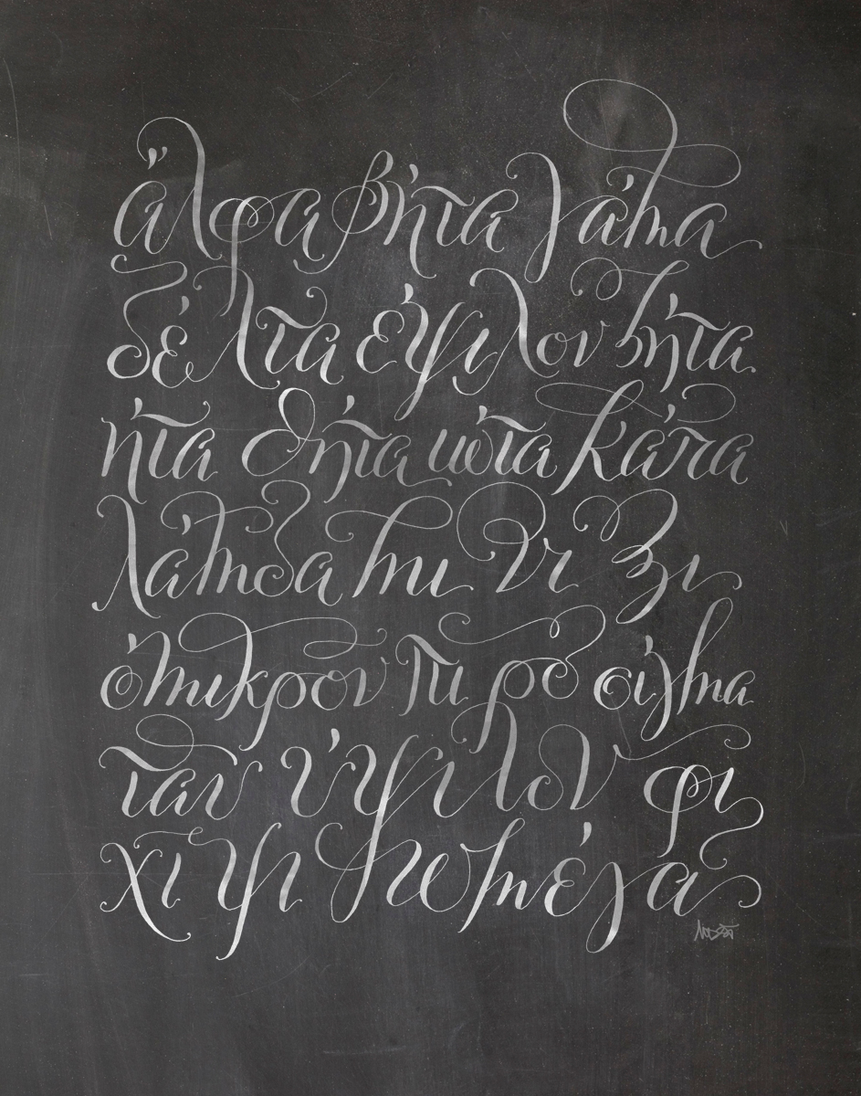 In my pursuit to learn Modern Greek, I've had fun playing with the letterforms of this beautiful alphabet. Traditionally, Greeks don't tend to write in script. There is a history of Greek cursive, but the letterforms didn't stick, and cursive isn't taught in schools here. As such, I've been doing a lot of research and experimenting to play with the letterforms and push the bounds. Old Greek signage around Athens has provided lots of inspiration, but I've also played with the glyphs a lot on my own.
