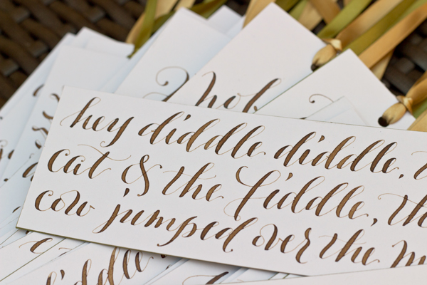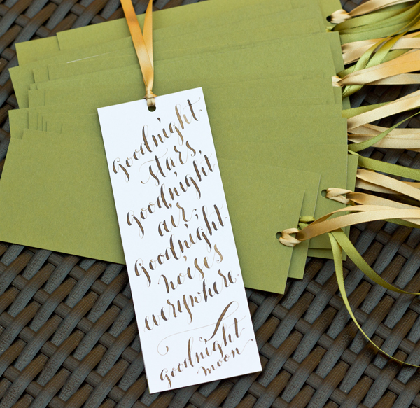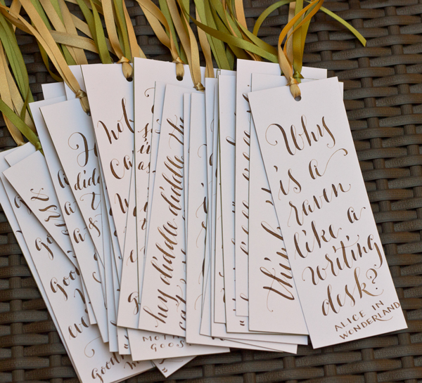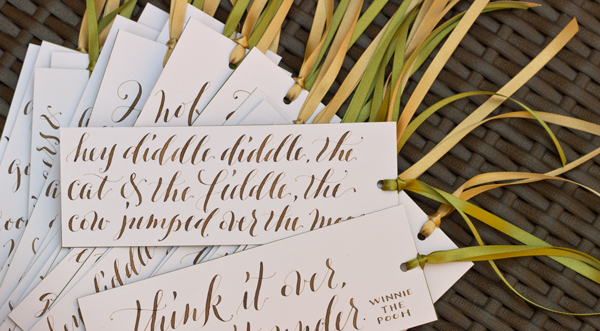 One of my very oldest friends is due to have a baby girl in October. Sadly, I couldn't make it all the way to Boston for her baby shower, but I still wanted to make a contribution. The party theme was children's books – each guest had to bring their favorite one – so I thought it appropriate to make bookmarks as favors. They're made of bristol paper and olive cardstock with grosgrain ribbon tassels, and in walnut ink, I calligraphed famous children's book lines on each one.