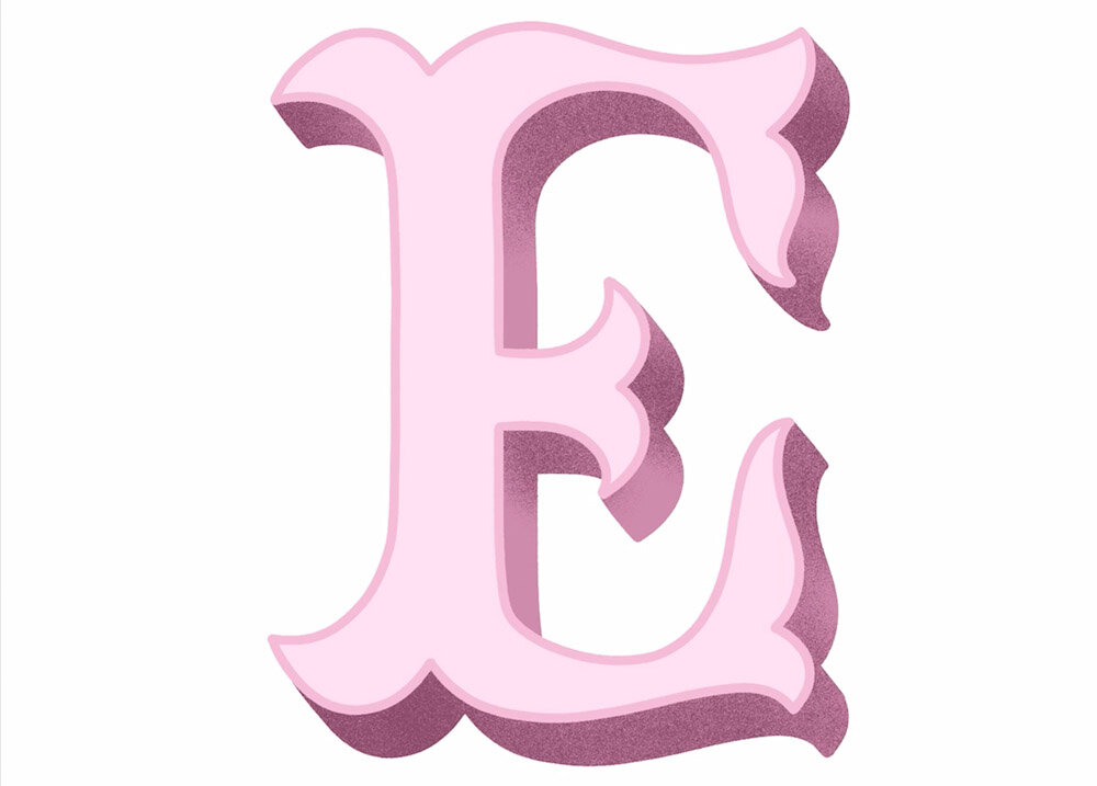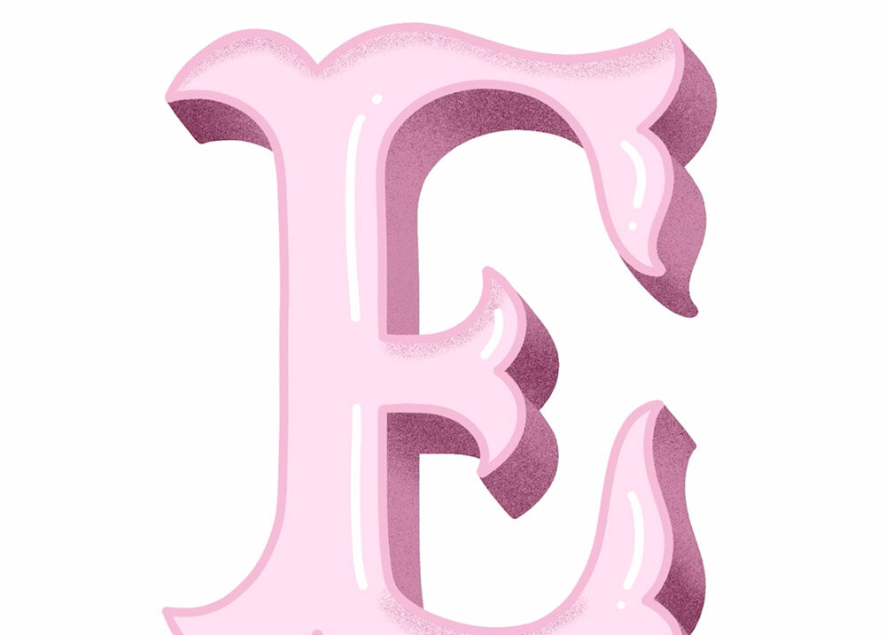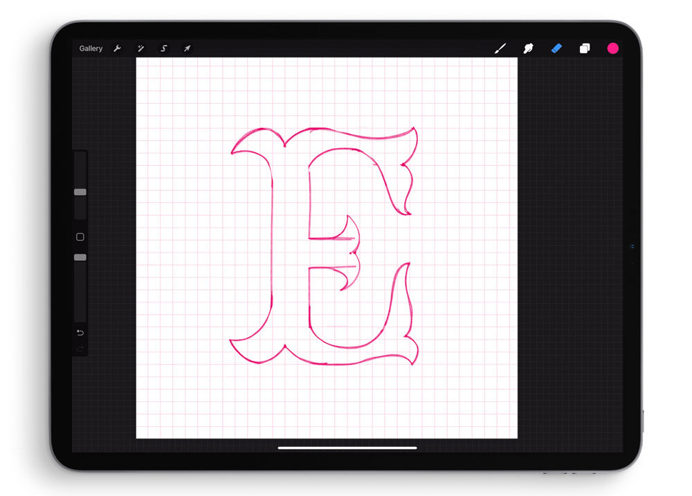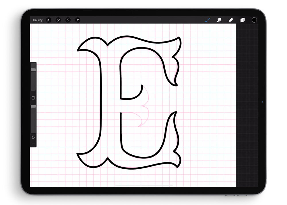 With a pencil brush, I start by sketching a basic, geometric E as my starting point. Then I’m going in and turning all the sharp corners and flat sides into curves. This is a quick and easy way to add decoration to any uppercase letter!