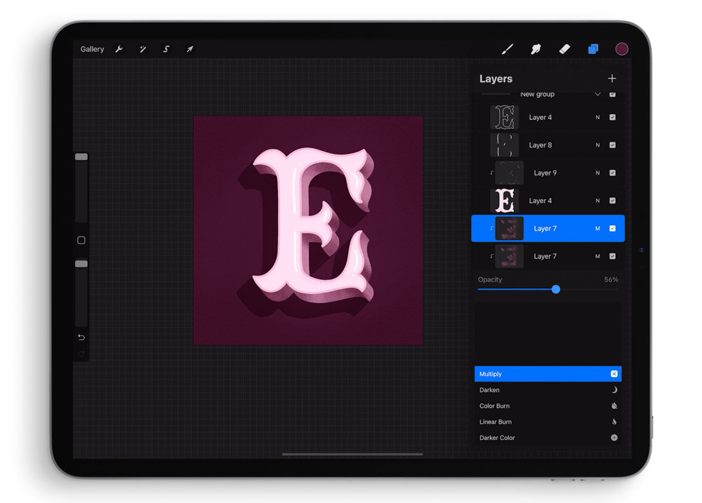 Learn how to make this three-dimensional uppercase E in Procreate, with textured shading, highlights, and drop shadow effect. You can get the color palette that I’m using for free by clicking the big purple button below! The brushes I’m using are from my Ultimate Lettering and Calligraphy Procreate Kit.