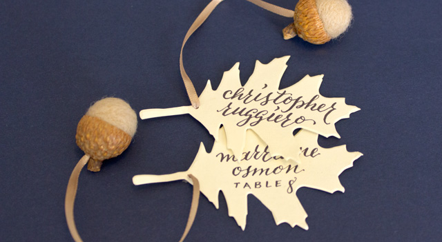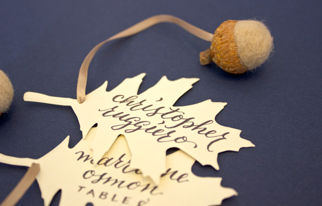 Fall is rapidly approaching, although you wouldn't know it here in Los Angeles, where it has hovered in the 80's for the past couple weeks and even hit 100° last weekend. Nonetheless, I've already unpacked my apple spice candles, baked my first pumpkin pie, and moved some sweaters to the front of my closet. In the process, I was reminded of this fun order I did for an October wedding last year. I calligraphed guest names in brown gouache onto paper oak leaves, each of which was affixed with ribbon to a felted acorn from Fairyfolk. (Yes, the acorn caps are real!)