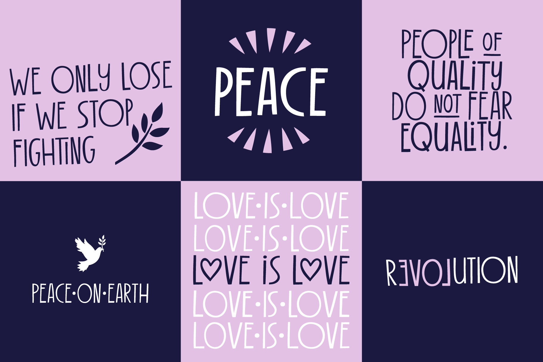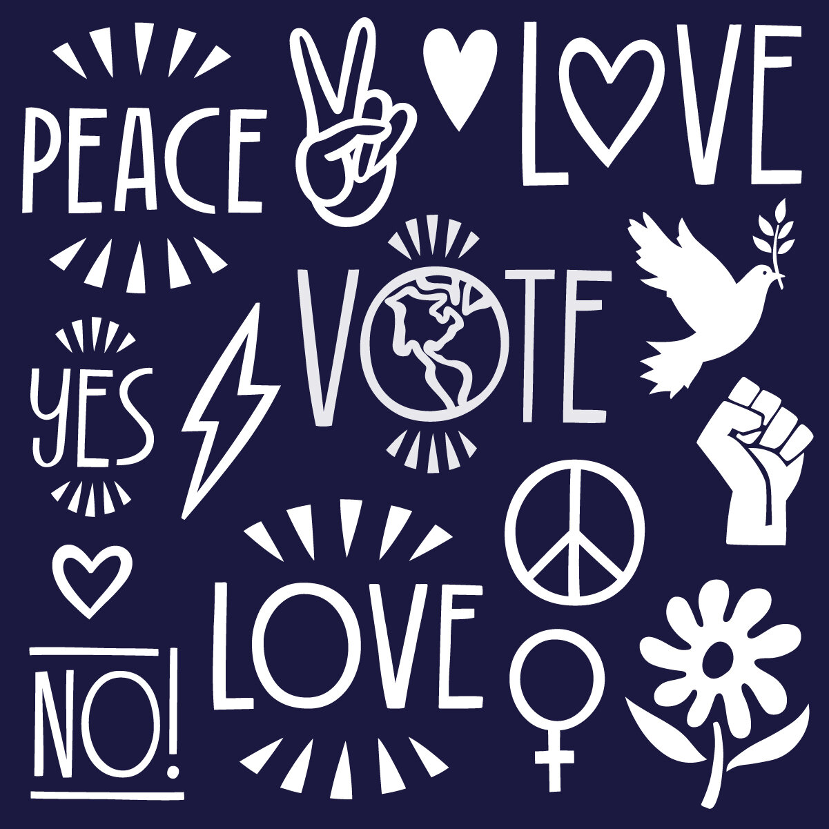 It includes a set of decorated word ligatures comprised of common protest words like 'peace,' 'vote', and 'yes!'. You'll also get the separate ornament components so you can create all the decorated words you want! Additionally, you'll get a full set of common protest icons, such as a raised fist, planet, dove, and peace sign.