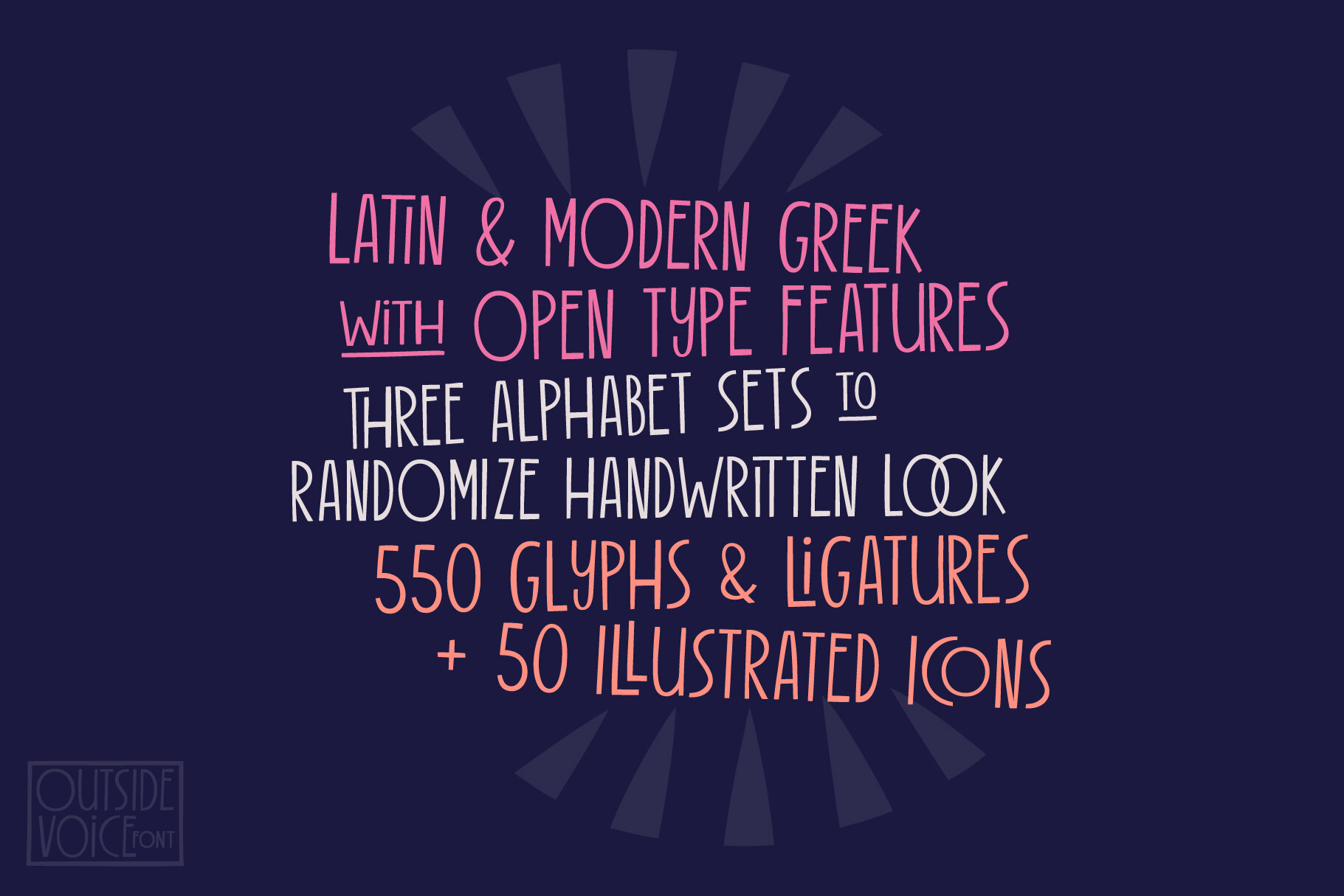 To get the most out of Outside Voice, it is best to use software that supports Open Type fonts (Adobe programs, Corel Draw, Affinity Designer, etc). This type family has tons of built-in OpenType ligatures and alternates, which are what make it so customizable and decorative. The most is the contextual alternates, so be sure to turn those on! This is what turns on the cycling between the three alphabet sets. You can always access the ligatures, alternates, and icons through your software's glyphs panel. (If you don't know how to use open type with your software, this is a great guide, but Google and YouTube are great resources, too.)