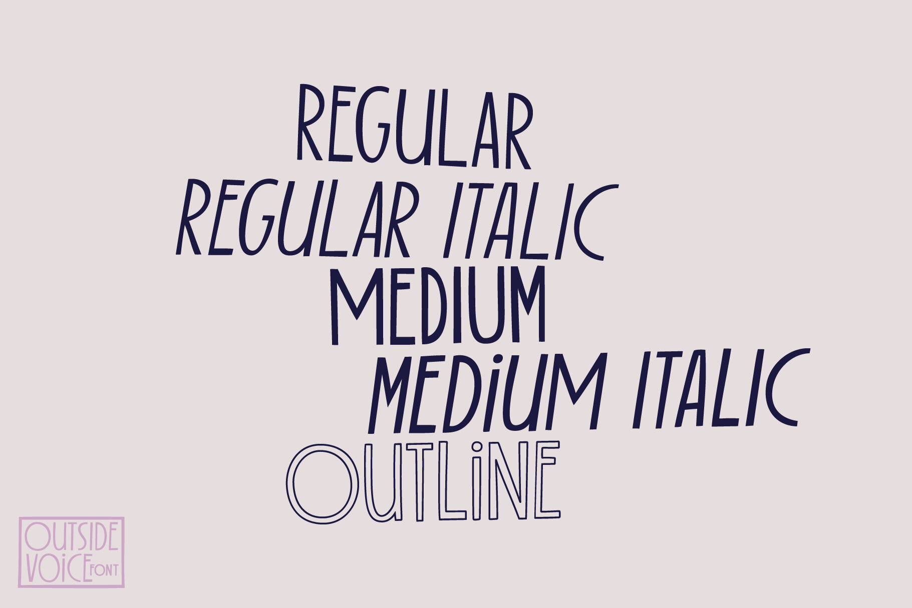 The result is type that looks as imperfect and handmade as a digital font can get. This makes Outside Voice a wonderful choice for pairing with hand-drawn illustrations. Consider varying the size, slant, and/or color of each line in your layouts. These adjustments make Outside Voice look even more handmade and organic, which is great for fun designs like posters and quotes.