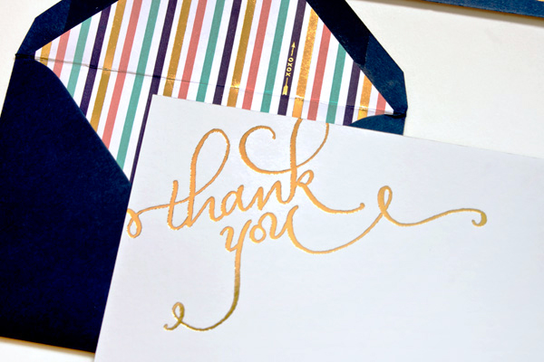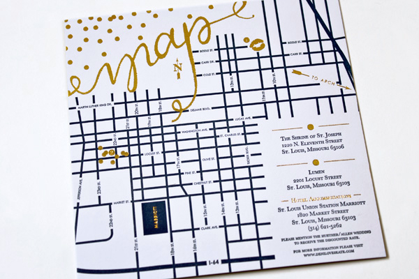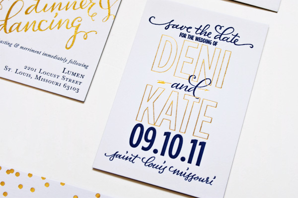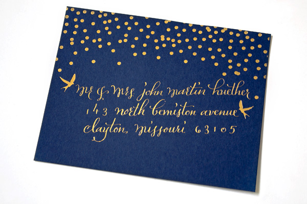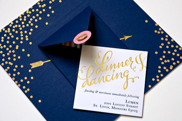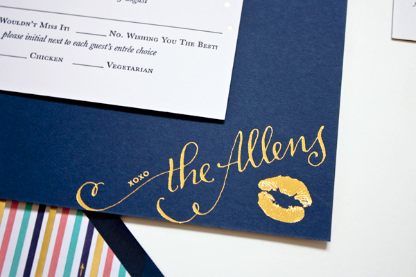 I don't think that any photographs can do this suite justice. None can capture all the tiny details, let alone the experience of opening that outer envelope and pulling out each gorgeous item, one after another. Each double-thick letterpressed piece was double-sided and printed with navy ink, gold foil and small touches of coral. The three envelopes were lined with custom liners of coral, teal, navy and gold stripes, with a tiny "xoxo" gold foiled on each one.