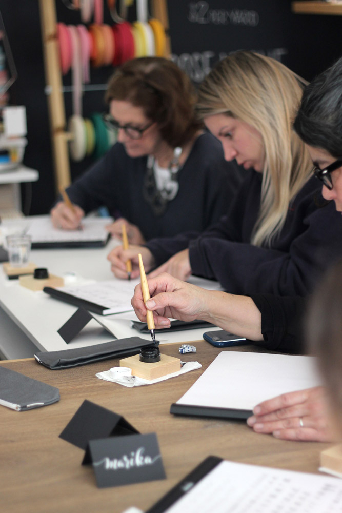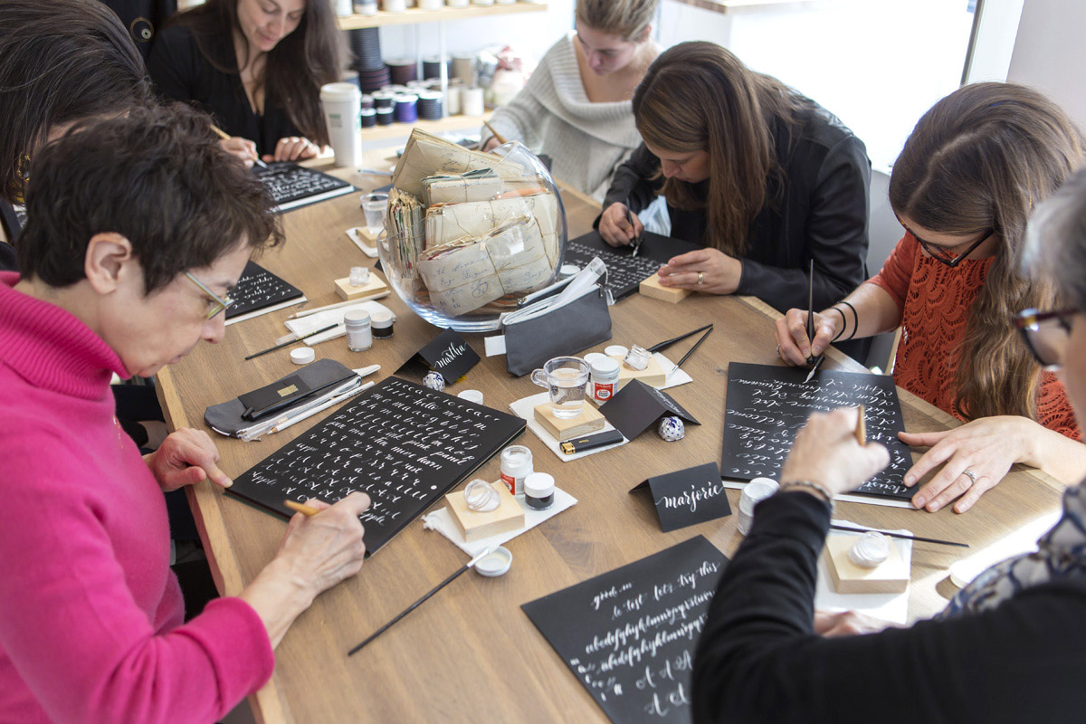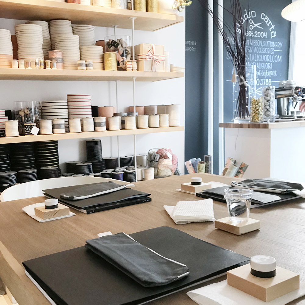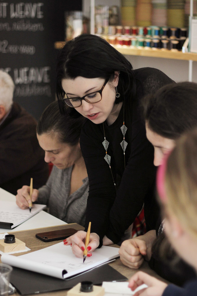 Earlier this month I had the privilege to teach three classes — two beginner level and one intermediate — at Studio Carta, a beautiful shop in Brookline, Massachusetts. The driving force behind the studio, Angela Liguori, designs sumptuous ribbon in every hue and texture you can imagine, then has it all manufactured in her native Italy. The walls of colorful ribbon spools made for a stunning backdrop to my classes, for which I provide predominantly black and white tools and ink.