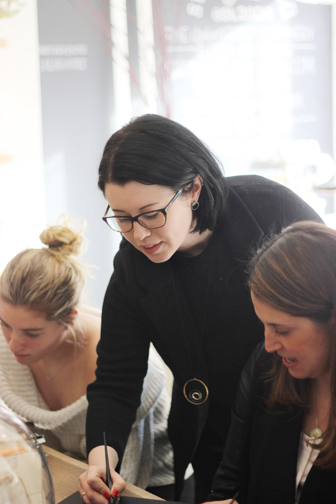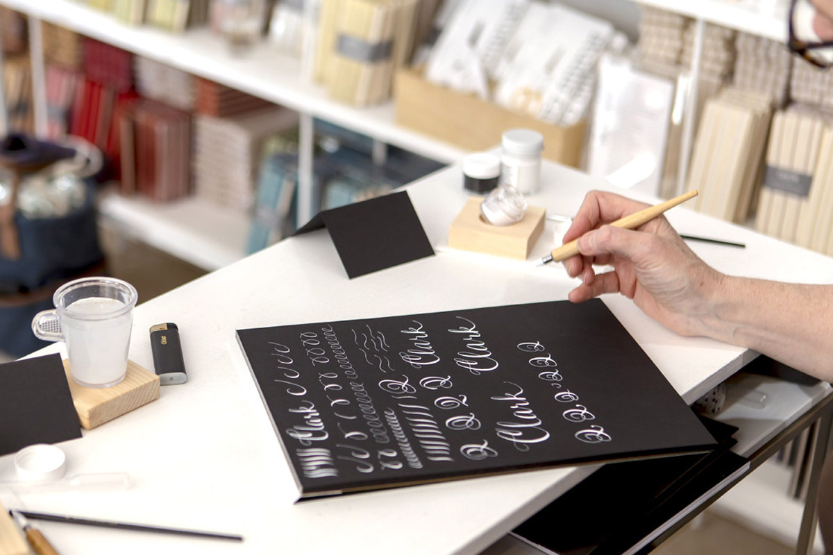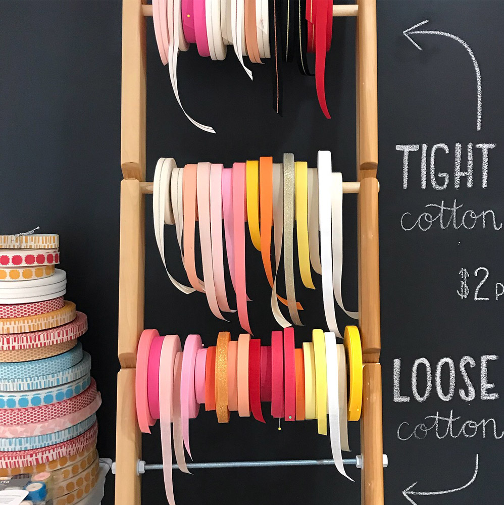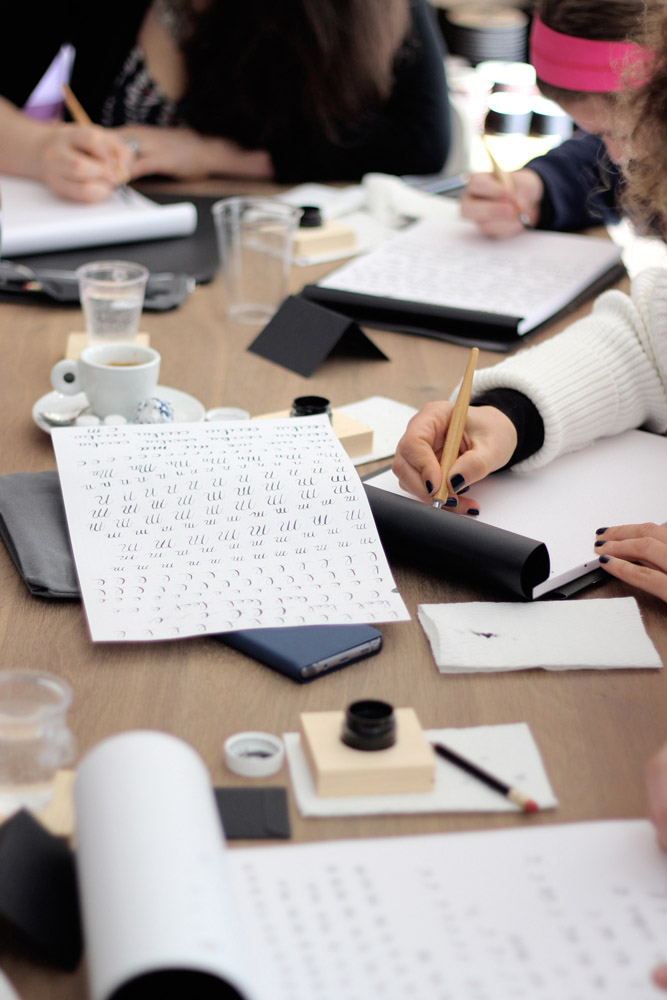 Earlier this month I had the privilege to teach three classes — two beginner level and one intermediate — at Studio Carta, a beautiful shop in Brookline, Massachusetts. The driving force behind the studio, Angela Liguori, designs sumptuous ribbon in every hue and texture you can imagine, then has it all manufactured in her native Italy. The walls of colorful ribbon spools made for a stunning backdrop to my classes, for which I provide predominantly black and white tools and ink.