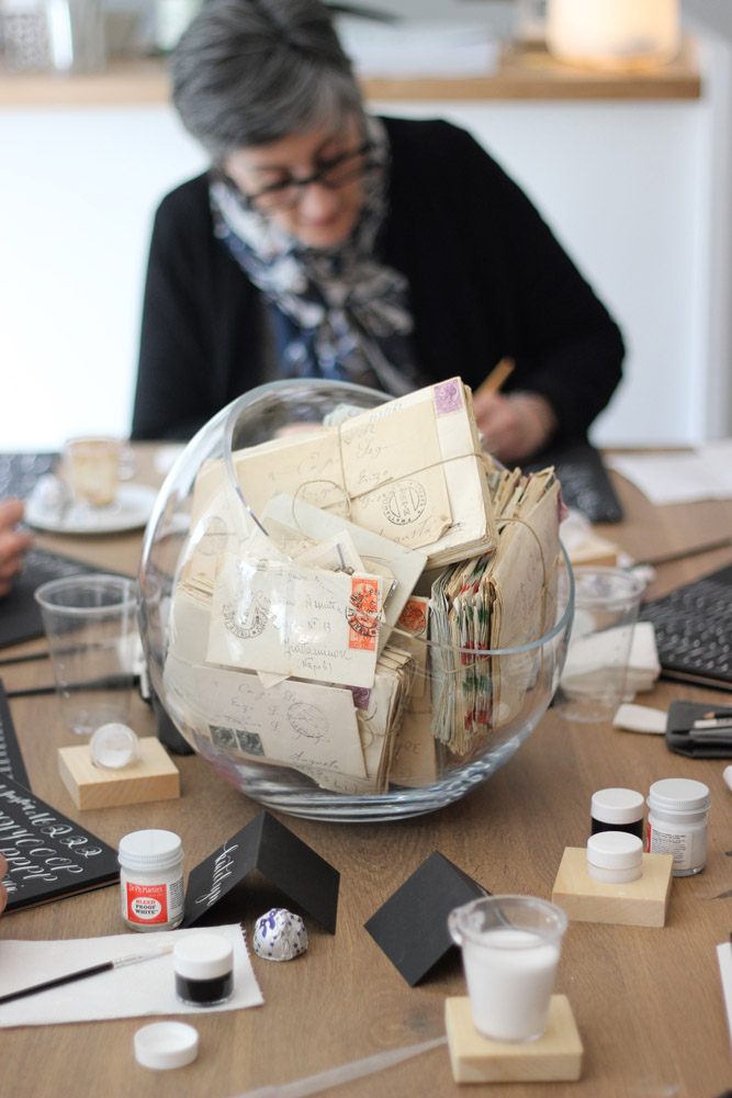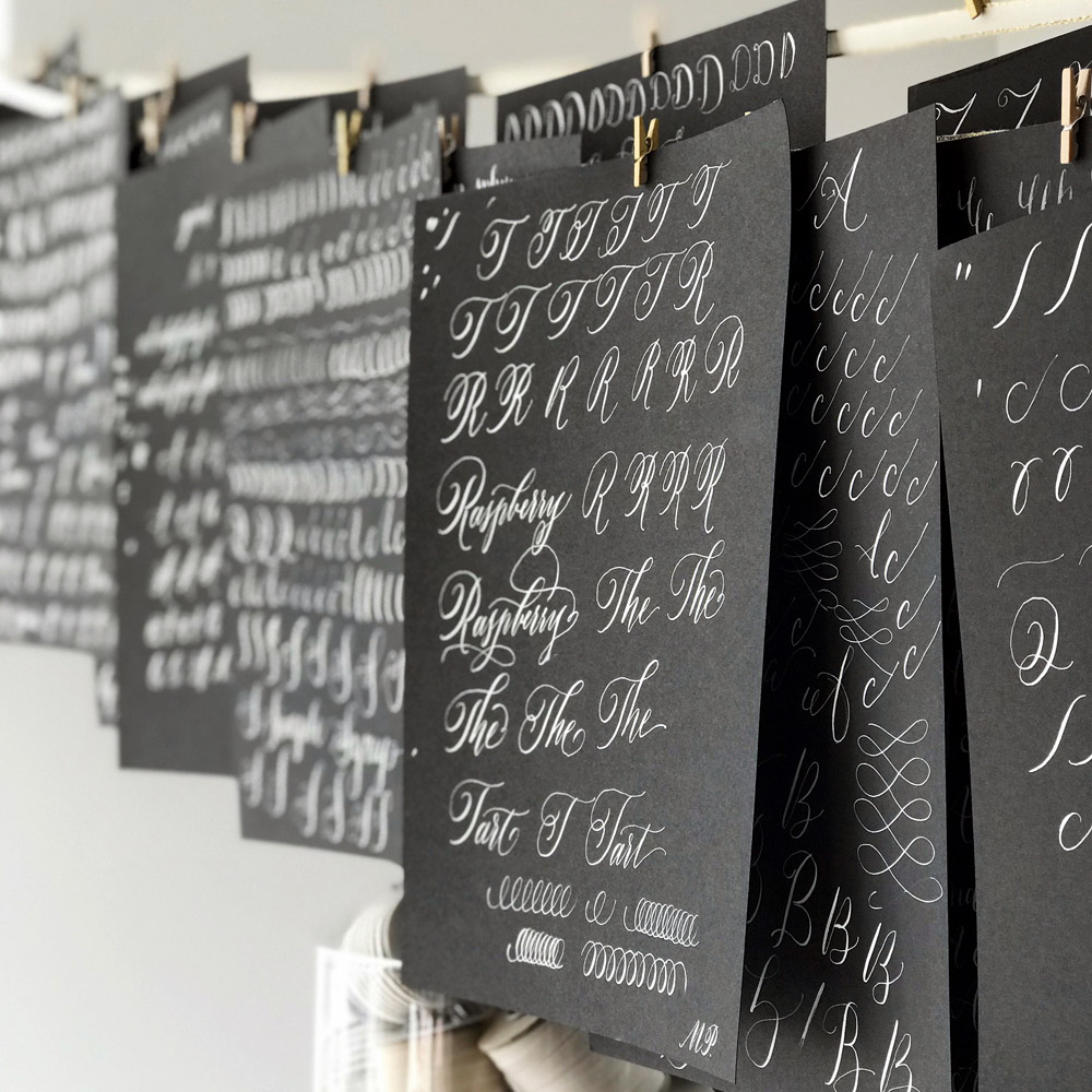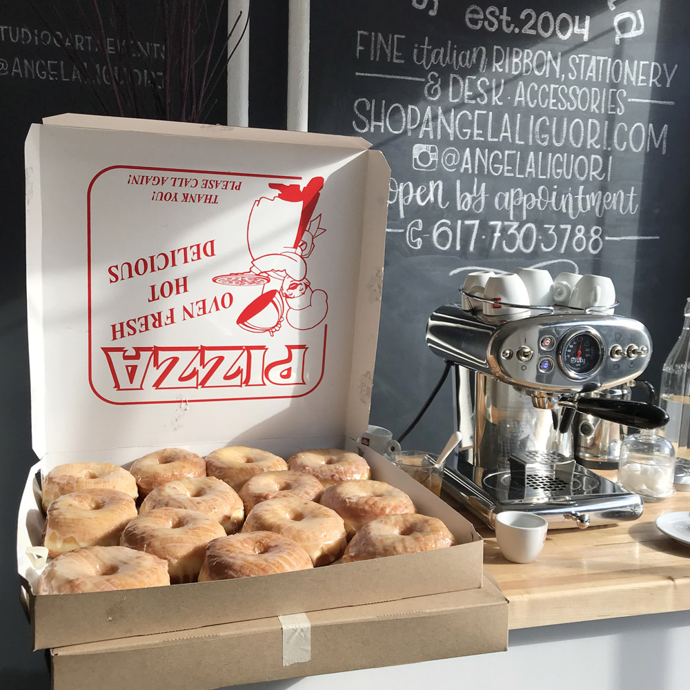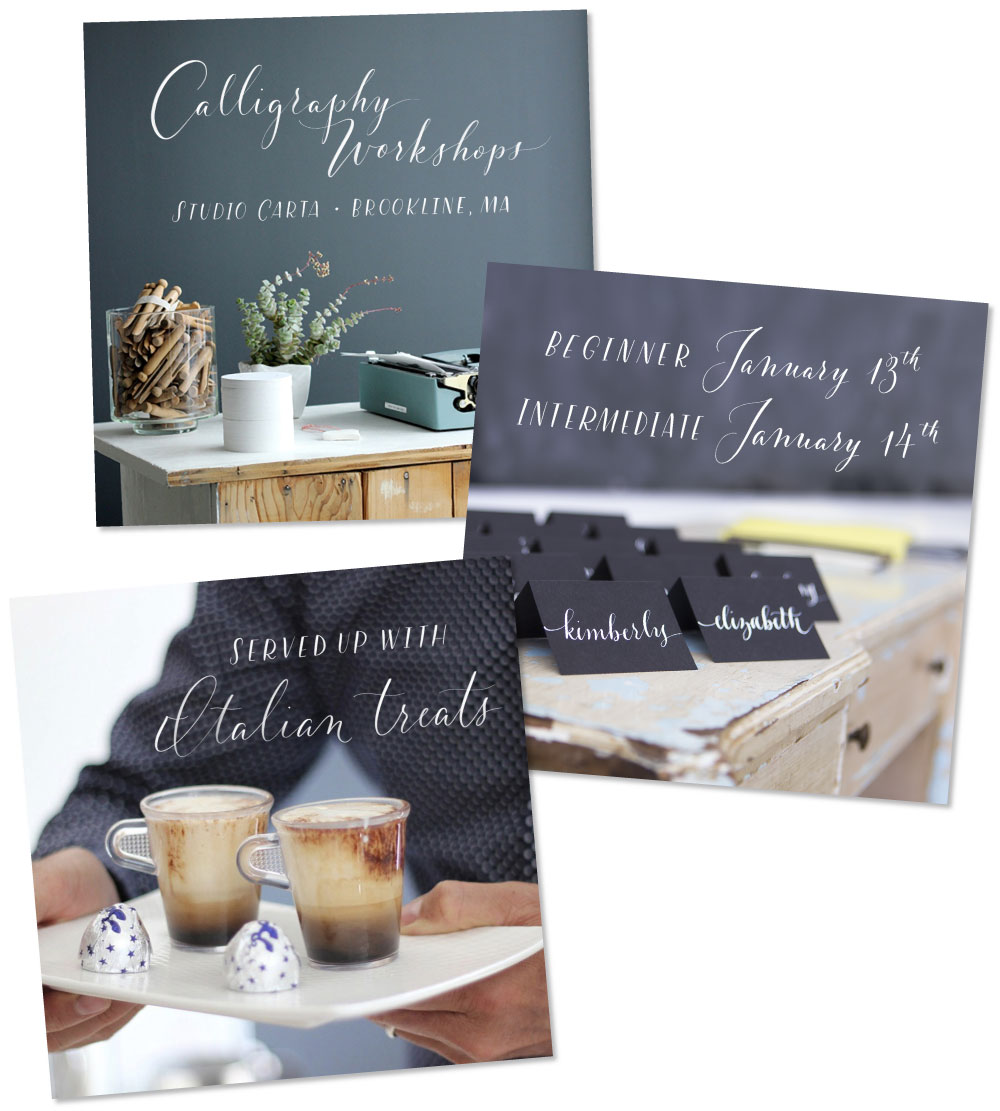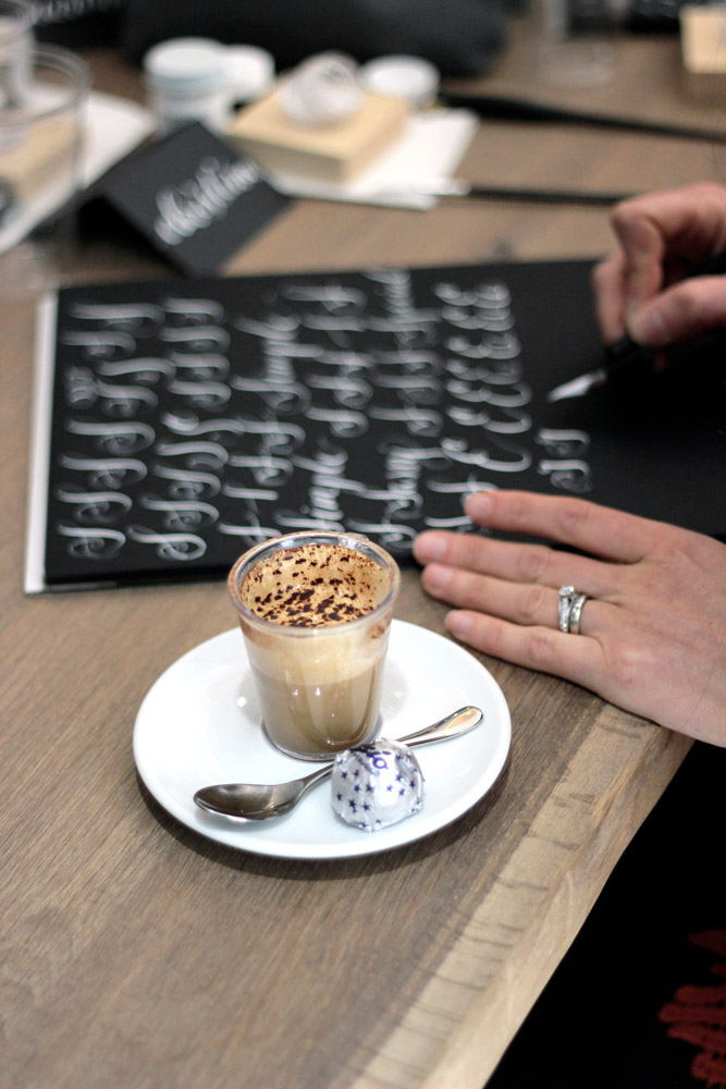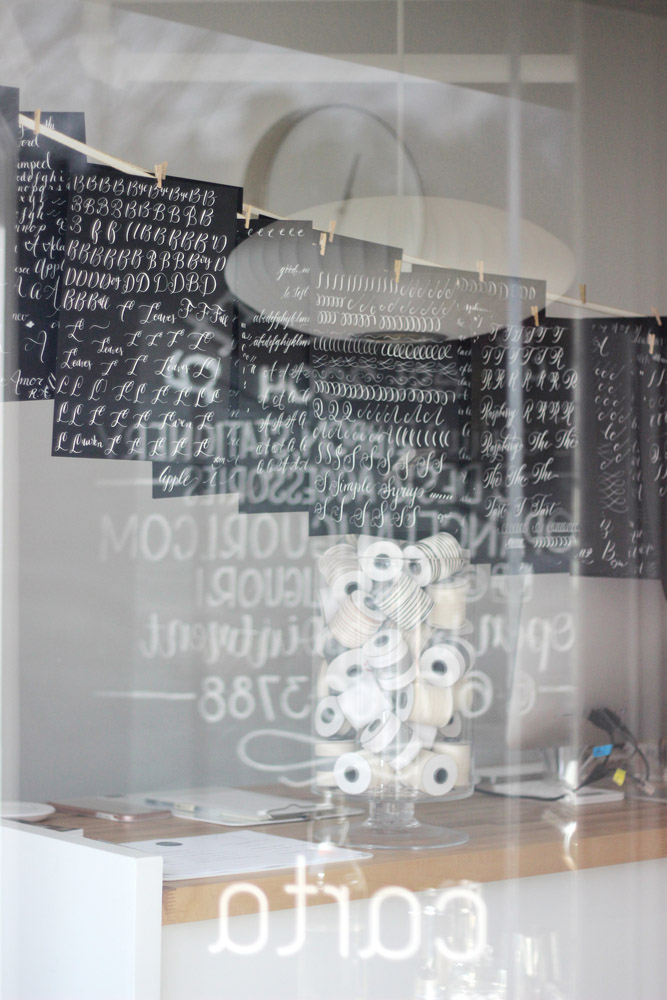 With snow and winds outside of -10° F, we stayed cozy inside. Angela’s husband and business partner, Mohamed, kept us supplied with espresso macchiatos, served up with Baci chocolates and Italian honey candies. For drying students' calligraphy practice sheets, he strung ribbon across the room and hung the papers up with clothespins. Not only functional, the result was absolutely gorgeous.