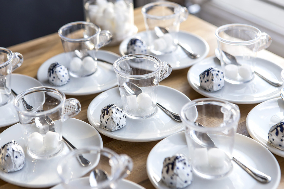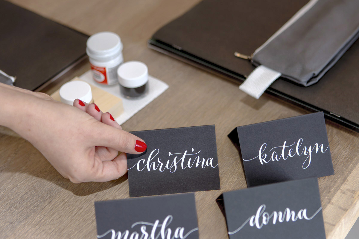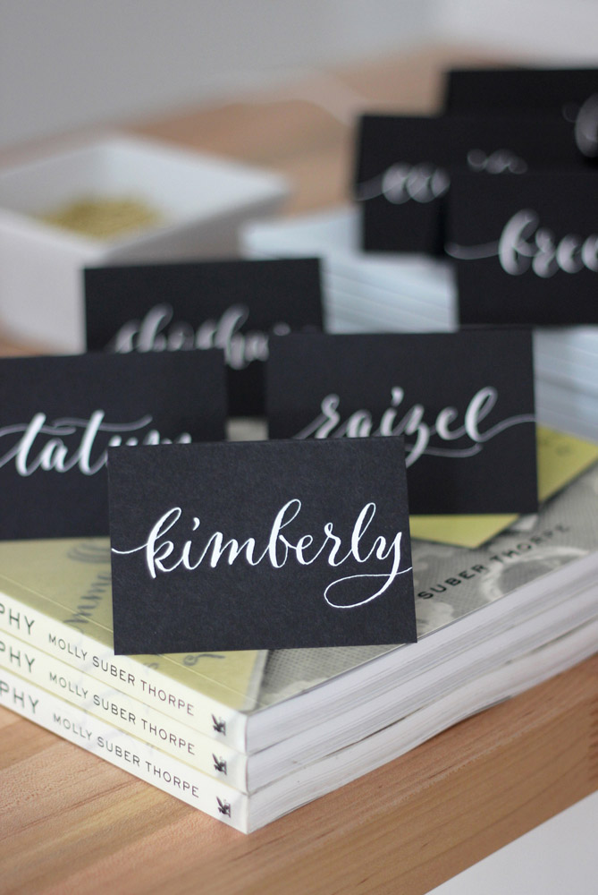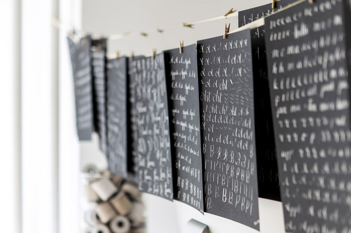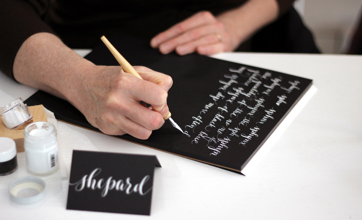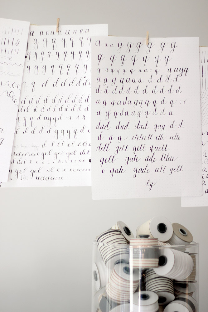 With snow and winds outside of -10° F, we stayed cozy inside. Angela’s husband and business partner, Mohamed, kept us supplied with espresso macchiatos, served up with Baci chocolates and Italian honey candies. For drying students' calligraphy practice sheets, he strung ribbon across the room and hung the papers up with clothespins. Not only functional, the result was absolutely gorgeous.