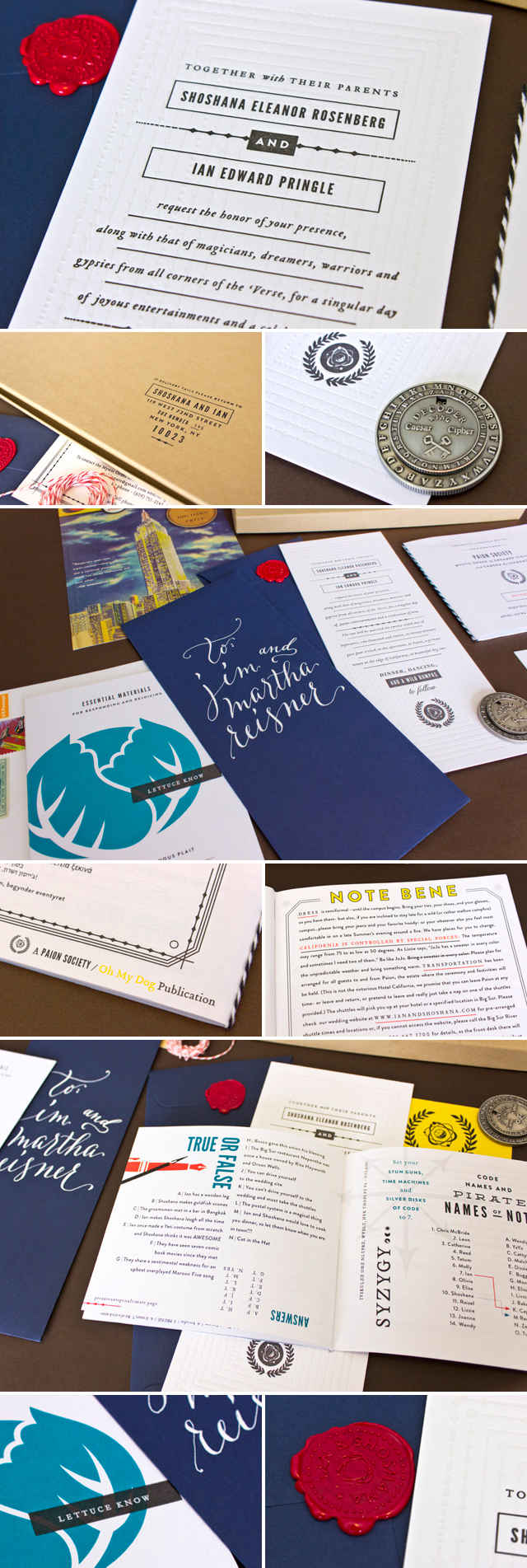 Every so often a project comes along that is so energizing and fun that it entirely reboots my creative drive and re-inspires me to be the best designer I can be. Very often, these projects are collaborations with other designers, where the meeting of minds proves true the old adage that "the whole is greater than the sum of its parts." In the case of this invitation suite, I was lucky enough to join forces with two other creative minds: graphic designer Megan Knight Gonzalez of MaeMae Paperie and the bride, Shoshana Rosenberg. Our cross-country collaboration (from LA to Minneapolis to NYC) manifested itself as long email threads and brainstorming explosions, resulting in one of the most exceptional, unique invitations that I have ever laid eyes (or hands) on. It is as beautiful as it is absurd; as funny as it is peculiar.
