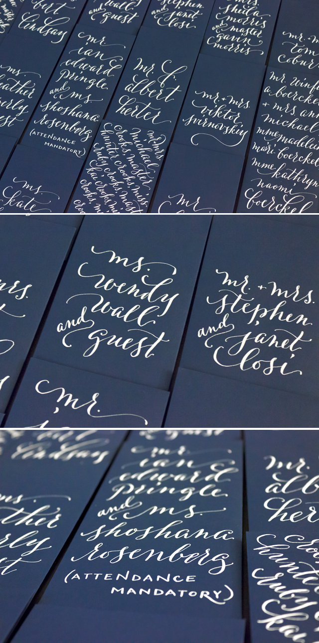 - Navy #10 envelopes calligraphed with guests' names in white and sealed with custom-made red wax seals that said "Ian & Shoshana" were the first elements recipients saw when they peeked inside.