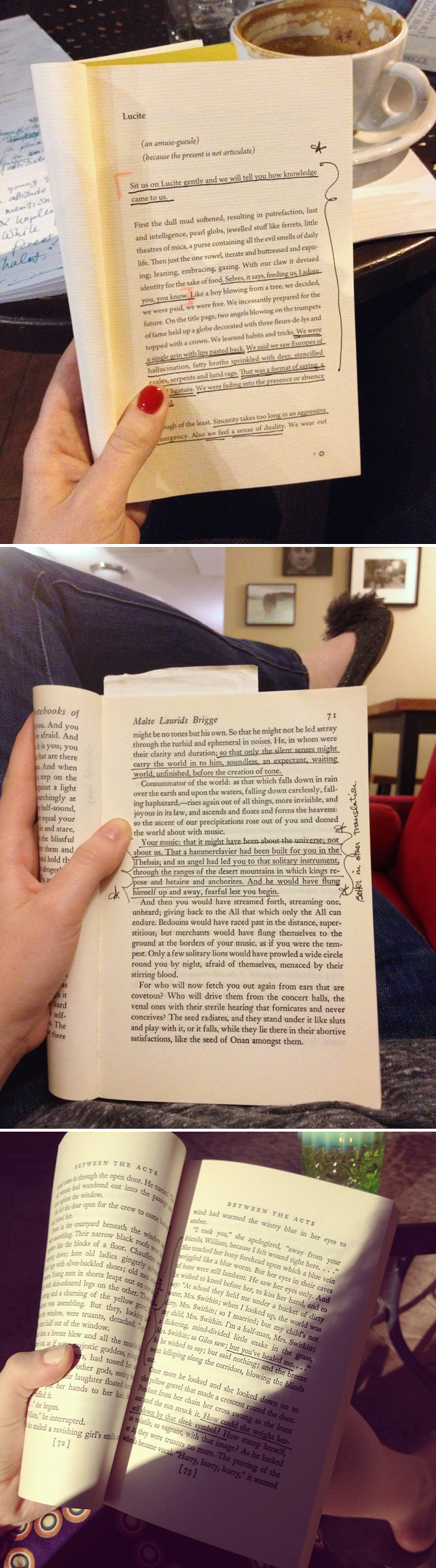 An unusually sore writing hand has given me an excuse to leave my calligraphy desk a little more than normal recently, and allowed me to indulge in one of my absolute favorite pastimes: rereading my favorite books. For me, rereading a favorite book is like being reunited with a long-lost best friend, late at night, in a field in Iceland, under the aurora borealis, while sitting on a Pendleton jacquard blanket, sipping strong African coffee poured from a thermos into vintage jadeite milk glass bowls, as curious reindeer stand at a distance watching us. In other words, my idea of perfection. Above, three of my favorites. From the top, with some favorite lines: