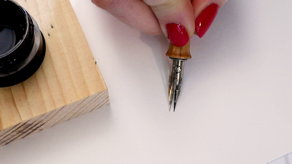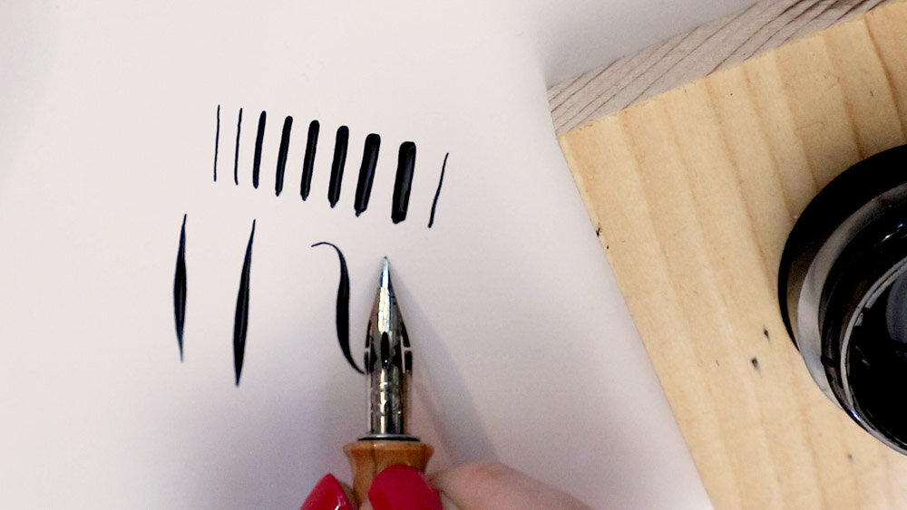 So when a pointed pen is inked and you are writing without any pressure, the width of your written stroke is only as wide as that of the point of your nib. This means that writing with no pressure gives you a very thin stroke. But as you increase pressure, ink flows like a river between the gap in the two tines. The harder you press down, the wider the pen tip becomes, and the thicker your calligraphy stroke is.