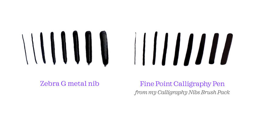 Here you can see me using my Fine Point Calligraphy Pen to create strokes of varying widths, just as I did a moment ago in ink. My hand was exerting the same pressure that I did with my dip pen. You can see that the resulting strokes, look very similar in width and shape.