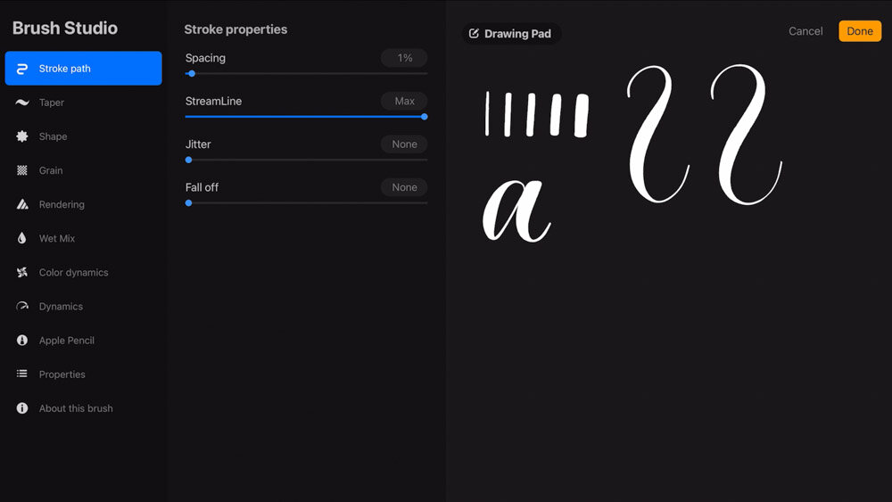 Here I’ve tapped on one of my own brushes, but you can open absolutely any drawing or lettering brush you have to follow along with me. I’m going to draw some basic calligraphic strokes in the drawing pad side of the Brush Studio. Then, I will adjust the setting called Streamline, which I have programmed to “Max” in my own brush. You can instantly see how streamline impacts the smoothness of a stroke.