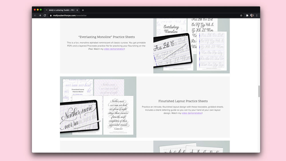 Just like my free calligraphy starter brush, this is part of Molly’s Lettering Toolkit. I release a new free download every single month, but at this time, I have more than a dozen practice files available.