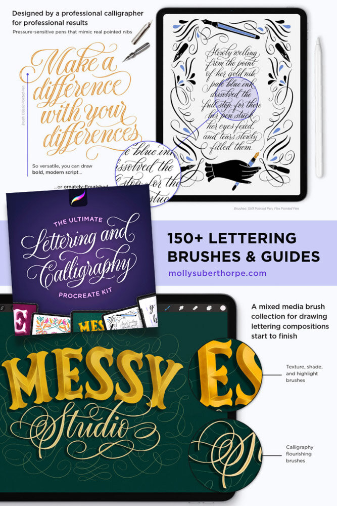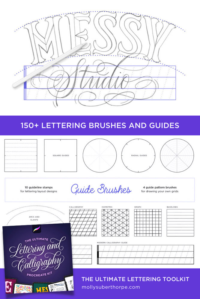 The Ultimate Lettering and Calligraphy Procreate Kit is a mixed-media brush collection with calligraphy pens, markers, watercolor and chalk writers, monoline pens, lettering guides, textures, and more. There are over 150 brushes in this kit, that will take you from sketching letters to polished compositions.