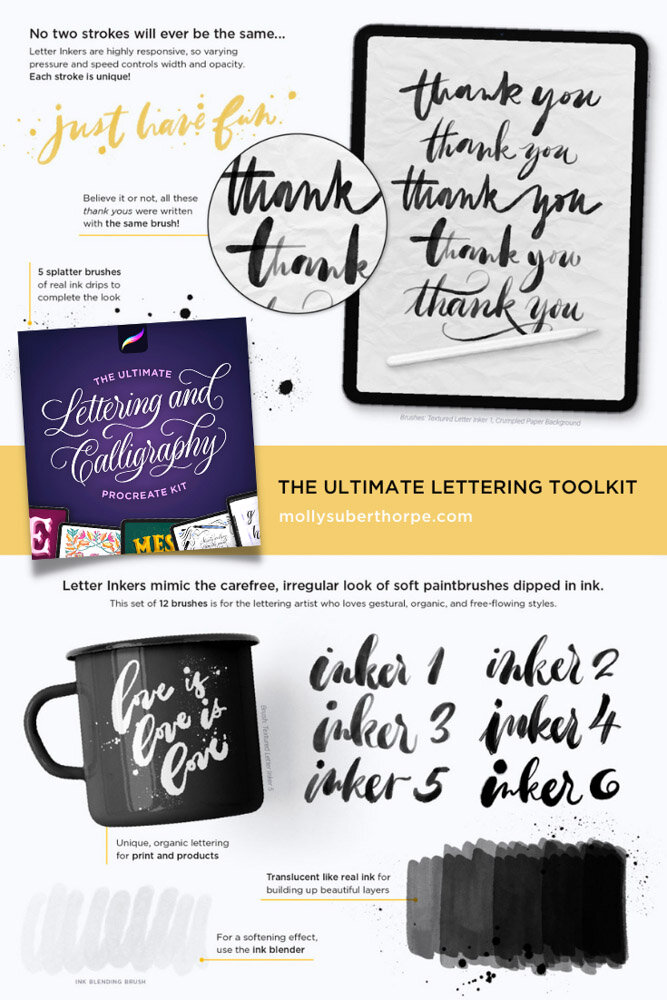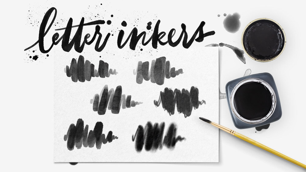 My Letter Inkers are one of my personal favorites, for their unique flow and character. This is a set of 12 gestural ink brushes and real ink splatters. They mimic the carefree, irregular look of soft paint brushes dipped in ink, and are beautifully translucent – like fountain pen ink – so you can build up layers in your lettering.