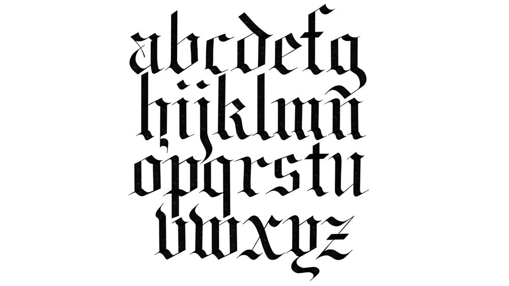 These Parallel Pens, just like their analog counterparts, are entirely dependent on your pen angle. Here is a sample of a Blackletter-inspired alphabet using the solid, classic Parallel Pen. You can see that this calligraphy combines thick downstrokes with extremely thin upstrokes, and again, those widths are created by two different pen angles.
