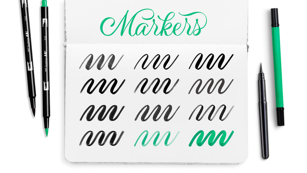 My marker set includes 12 felt tip and brush lettering tools, each of which mimics a different kind of marker. These range from soft brush pens to felt chisel tips to round alcohol markers.