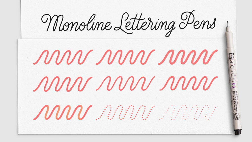 This kit contains nine Monoline Lettering Pens for lettering and also fine drawing and outlining. Because monoline pens are so crisp, I love using them to outline lettering that needs to be extremely precise or even vectorized later.
