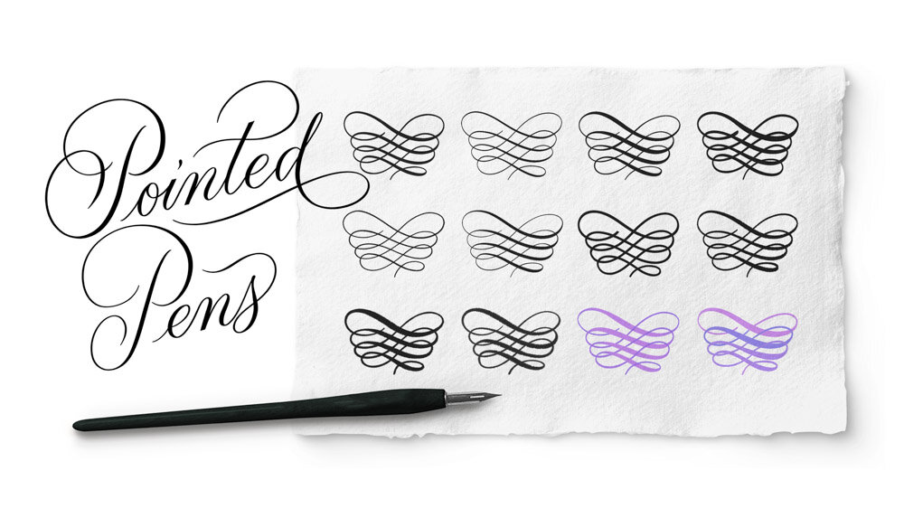 These will teach you this beautiful flourished pointed pen style, but will also teach you all the fundamentals you need to start using pointed calligraphy pens like a pro. So if you’ve never used a pointed pen before, start with the basics, where you will learn how pointed pens work based on pressure sensitivity and direction. Follow the arrows to learn the essential strokes before even moving on to letterforms.