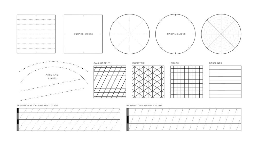 You’ll find stamps for square and radial guides, arced and slanted lines, and two calligraphy guide bars – one for traditional styles and another for modern styles. Combining these different stamp shapes allows you to create endless custom layouts for different lettering styles, sizes, and slants.