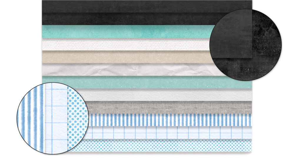 There are also 12 background pattern brushes in this kit, ranging from different types of art paper to chalkboards to fabric. Each of these brushes utilizes whatever color you select from your palette, and they are all translucent, making them perfect for combining and layering.