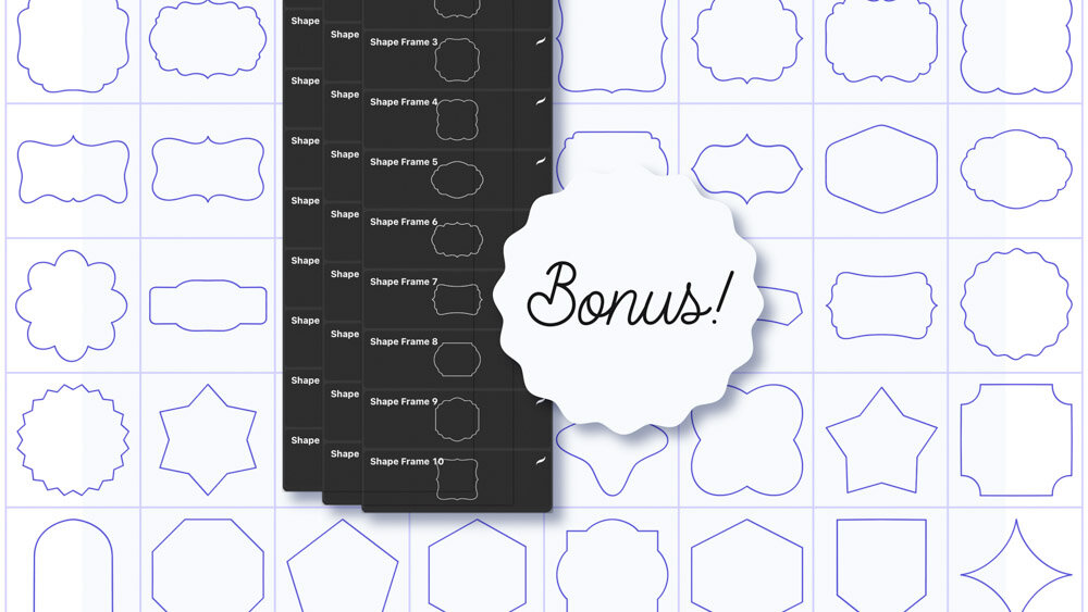 In addition to the 12 brush sets, 7 practice files, and 3 quick guides in this kit, you also get this bonus Frame Shapes Brush Set with 44 frame stamps.