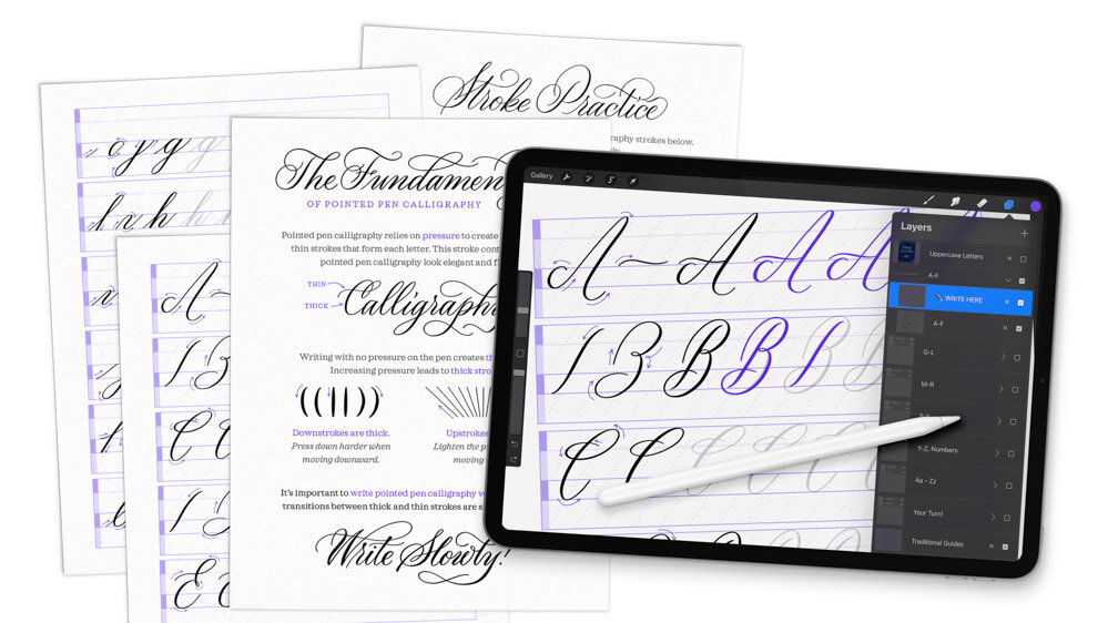 This set is not just for experienced professionals, so if you are new to pointed pen calligraphy, welcome! You’re in the right place because this kit includes calligraphy practice sheets, that come as three layered Procreate files and function like little workbooks.