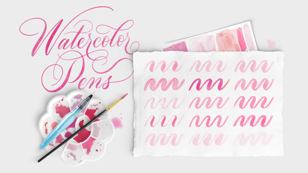 The Watercolor Pens are a set of 16 brushes, optimized for calligraphy and lettering. They are elegant, ethereal watercolor writers with different strokes, textures, and opacities.