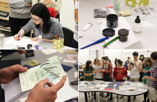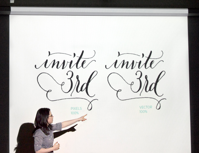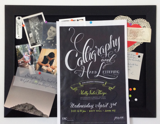 Back in April I had the opportunity to give a lecture at USC's Roski School of Fine Arts. The subject was calligraphy and hand lettering with a slant toward graphic designers who aim to incorporate handmade type into their digital work. Unlike other lectures and workshops I've led in the past, given this audience, I was able to go beyond the paper realm and delve into the nitty gritty details of digitizing hand lettering, answering all the geeky questions about bézier curves and pixel depth the students could throw at me. It was so much fun to meet a room full of young designers who approach their design work from wildly different angles but have a common love of all things typography.