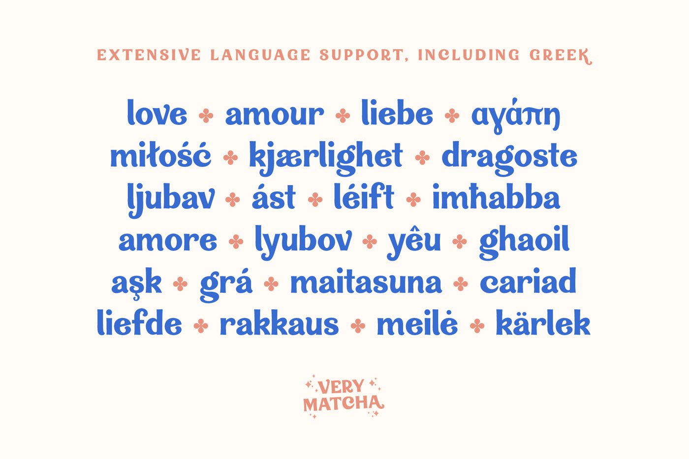 Very Matcha includes the Latin and Greek alphabets with all accent markings. The most common languages it supports are: English, Catalan, Danish, Dutch, French, German, Greek, Italian, Norwegian, Portuguese, Spanish, and Swedish.