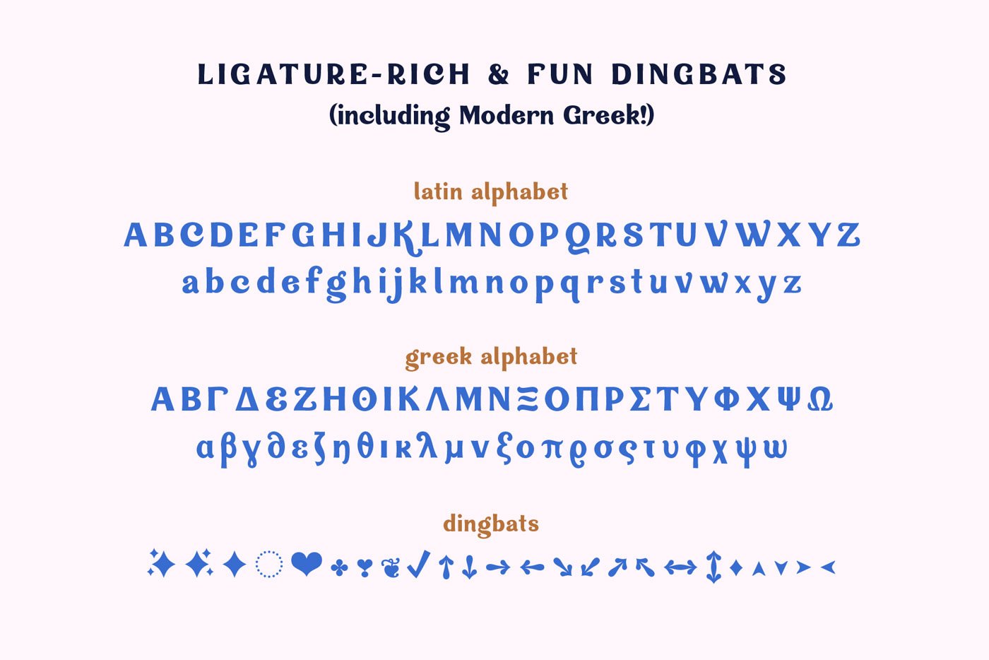Very Matcha has uppercase and lowercase alphabets, dozens of beautiful ligatures and dingbats, and includes support for Modern Greek.