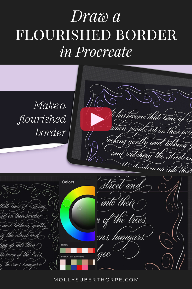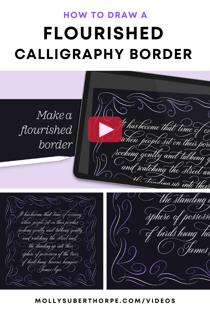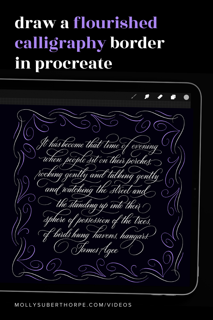 Watch me create a flourished, calligraphic border for a calligraphy quote I drew on my iPad. This technique utilizes Procreate’s symmetry drawing guides and my Calligraphy Nibs Procreate Brush Pack.