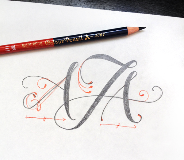 Monograms can be deceptively difficult. A well-designed monogram should look effortless but can take many, many more rounds of editing than full words or larger layouts. Above, a monogram I'm almost finished with – I think this may be the last round of revisions!